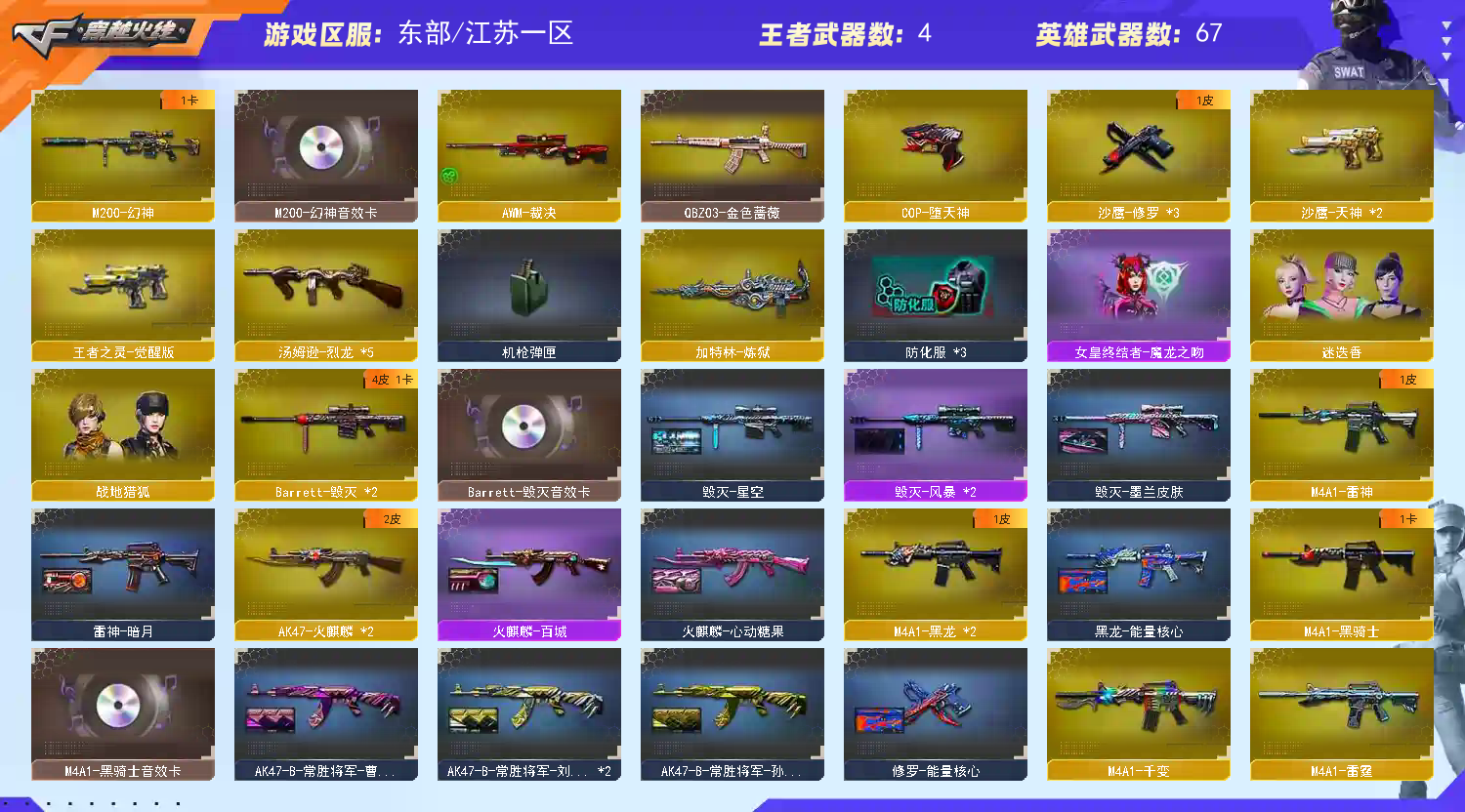 【主 武】:M200幻神、HK417朱雀、M4A1堕天神、M4A1雷霆、王者之魄(已觉醒)、炫金骑士、千变、火麒麟(CFSTAR)、黑龙(能量核心)、雷神(暗月)、黑骑士(黑骑士音效卡)、黑鲨、龙血、玫瑰精灵、AK47-猩红传说(老兵传说皮肤)、AK47-B-战士、AK47-B-战神(粉色甜心皮肤、流金岁月皮肤、紫媛金章皮肤)、毁灭X2(毁灭音效卡、星空皮肤)、裁决、Barrett暗月传说、加特林炼狱、烈龙X2、金牛座、神罚、乱世、斯太尔恶棍、死亡之眼、征服者、激光毁灭者3级、巴雷特零水下丽影