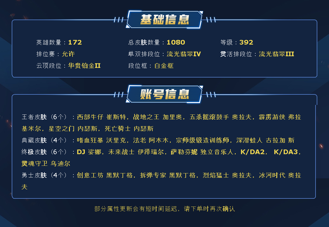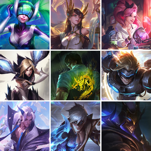 【629原皮肤101炫彩皮肤】至臻奶妈、至臻剑姬、至臻EZ、至臻劫、摄魂VN、海克斯乌鸦、海克斯鳄鱼、海克斯炸弹人、海克斯皇子、海克斯小炮、黑龙瞎、神凰行者霞、王国机神白虎贾克斯、王国机神玄武盖伦、王国机神朱雀蕾欧娜、星之守护者佐伊、玉剑传说刀妹、福牛守护者厄斐琉斯、烈焰美人VN、金猪烈焰猪妹、蛇年蛇女/火女/飞机、狗年狼人光辉、龙琴、灵能特工易、猴年猴子/女警/莫甘娜、羊年金克丝、花木兰、龙刀、K/DA ALL OUT萨勒芬妮、泳池派对女警/辛德拉/佐伊、光明哨兵VN、源计划鳄鱼、战斗学院女警、至尊魔女莫甘娜、灵魂莲华阿狸/锤石、神龙尊者瞎子、暗星尊烬、穿心之剑剑姬、创星之灵璐璐、魔女艾希、咖啡甜心格温、灵魂莲华亚索、灵魂莲华永恩、永恒之森霞、灵能特工莎弥拉/EZ、五杀摇滚之噪音佛耶戈、灵魂守卫、未来战士EZ、DJ琴女、冠军掠夺者、冰雪节老鼠、送披萨的小姐姐、甜心之翎洛、万圣节人马、勇者阿狸、御星魔矢、奥德赛凯隐、黑夜亚索、神拳、神王诺手、天煞劫、西部卢锡安、星守阿狸、宇航员纳尔、魔女婕拉/卡蜜尔/丽桑卓/妖姬、K/DA ALL OUT卡莎/阿卡丽/寡妇/阿狸