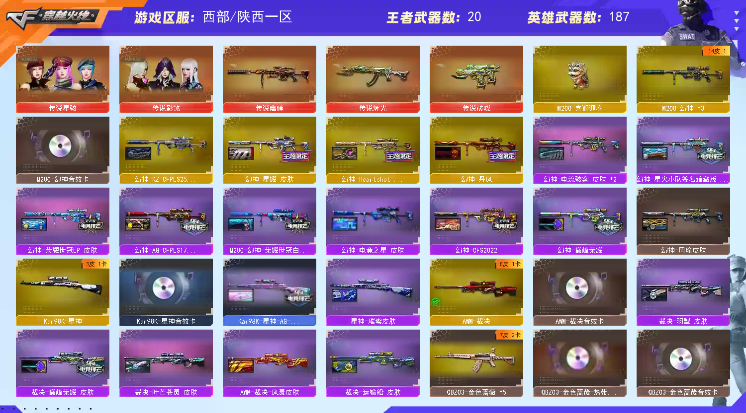 传说星骇传说幽瞳/三把幻神14皮肤KZ-CFPLS25冠军荣耀世冠EP电竞之星Heartshot女团星火小队星耀AG-CFPLS17冠军巅峰荣耀世冠白鲨CFS2022丹凤周瑜电流骇客幻神动物皮喜狮赋予/王者风神王者幻神竞技荣光/传说影煞传说破晓传说辉光/柯尔特荣耀世冠EP百战金芒世冠白鲨2023无冕之王雷暴神工天巧云龙/G36C幻影破浪逐光三件套/隼鹰晴雅雨墨云悠悠影豹 王者晴雅王者魅影职业经理 空零热舞青春兰梨园特工兰春雅灵花/满配主流副武器 22张音效卡156个枪刀皮/双王者冰锋 六盘六烈蝴蝶 炽芒蝶刃巅峰荣耀 炼狱8皮肤 猎手+终结者7皮肤/顶配生化 双模式全装 裁决卡 幻神卡 星神卡白虎卡QBZ卡毁灭卡雷神卡黑骑士卡等