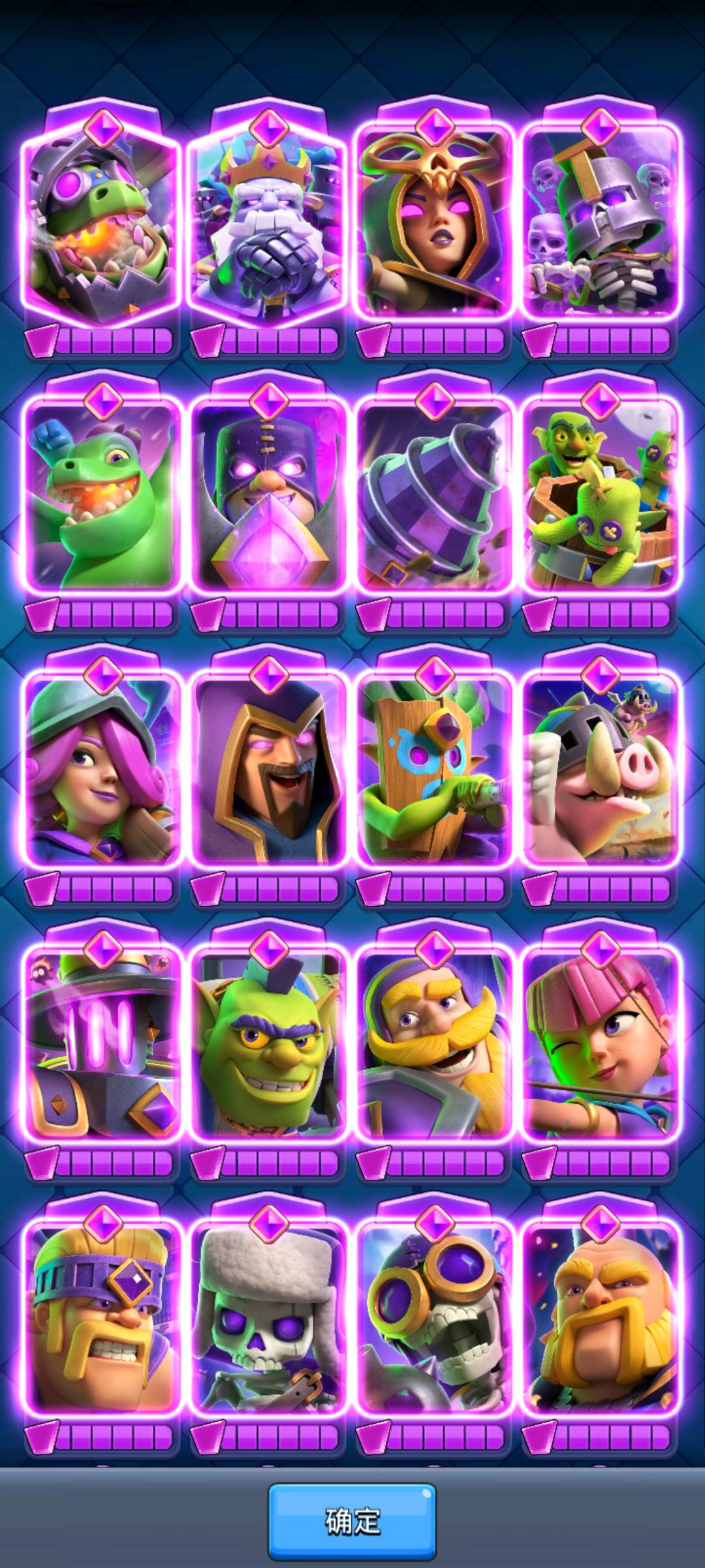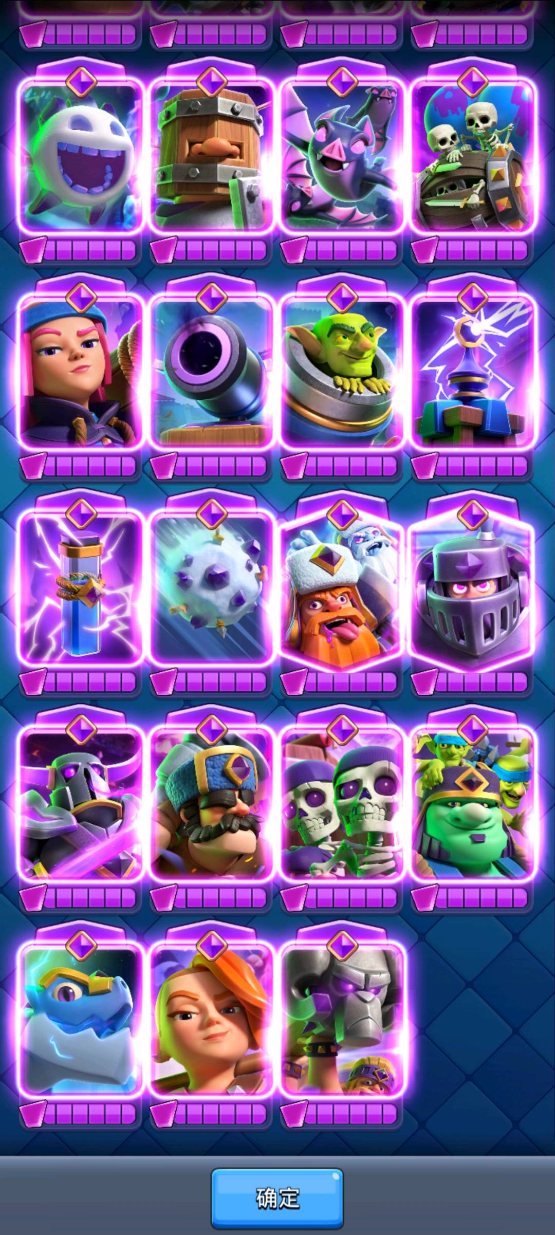 卡牌全16级满级,解锁全部觉醒卡,精英卡,所有卡金皮肤全满,有满级厨师塔,刀塔,炮塔,公主塔,新赛季钻石令牌,还有超多稀有表情,超多皇家塔皮肤,五百万金星点,五百万金币,三万多钻石,国服NO.1部落长老,经典挑战勋章,锦标赛,天梯五百名勋章都有~