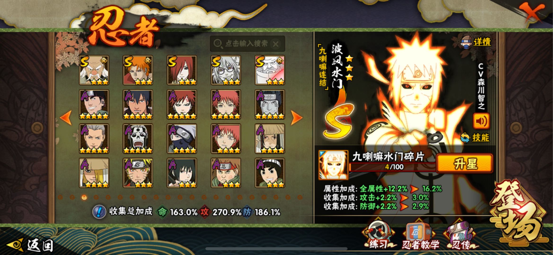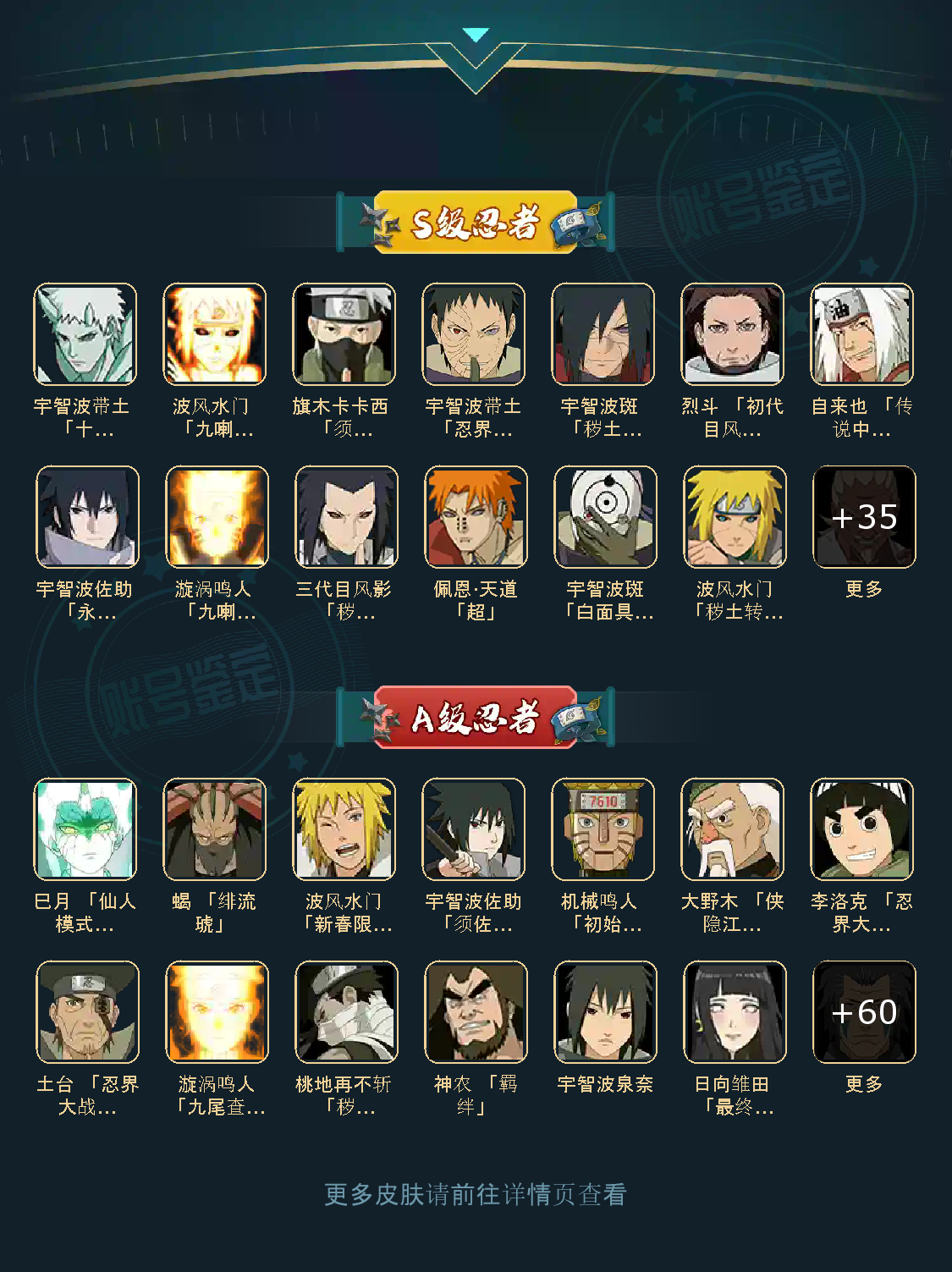 仙人自来也 纲手 波风水门 百战水门 猿飞日斩 千手柱间 宇智波斑 宇智波鼬 舞之自来也 大蛇丸 百战大蛇 秽土四代 秽土三代 秽土长门 仙人兜 黄猿九喇嘛鸣人 紫狗永恒佐助 樱婊忍战樱 秽土鼬 普通自来也 百豪纲手 死门凯 二代扉间 秽土二代 秽土初代 秽土柱间 白面具 须佐卡卡西 小胡子鬼灯幻月 雷影 土影 无 佩恩 百战佩恩 青年柱间 创立初代 秽土斑 青年斑 解斑 须佐止水 虎皮 破面带土 红夜带土 罗砂 秽土三代风影 忍战雷影 三代雷影 金角银角 秽土半藏 忍战大野木 小土豆 天道超 大筒木桃式 大筒木金式 钢铁之躯凯 桀骜之刃阿斯玛 狂野之鲨鬼鲛 飞段 黑飞段 百豪樱 忍战李 大卡卡西 五代水影照美冥 宇智波鼬 仙鸣 九尾查克拉鸣人 鹰佐 奇拉比 青年艾 半蛇兜 晓蛇 新春鼬 面麻 须佐佐助 疾风咒印佐助 忍战宁次 忍战天天 最终章雏田 幻容卡卡西 神卡 忍战卡卡西 泳装卡卡西 忍战凯 青春哥 惊门凯 爱情哥 新春止水 新春水门 青年水门 青水 新春我爱罗 泳装照美冥 侠隐照美冥 侠隐纲手 侠隐兜 漂泊再不斩 漂泊佩恩 漂泊二代 漂泊小南 漂泊佩恩 三船 青年三船 青年长门 泳装南 新春南 新春大蛇丸 晓创生角度 晓创生蝎 晓创生飞段 泳装鼬 鲛肌融合鬼鲛 新春迪达拉 秽土迪达拉 恶灵之影飞段 暴怒带土 忍战黄土 卑留呼 桃博 黑土