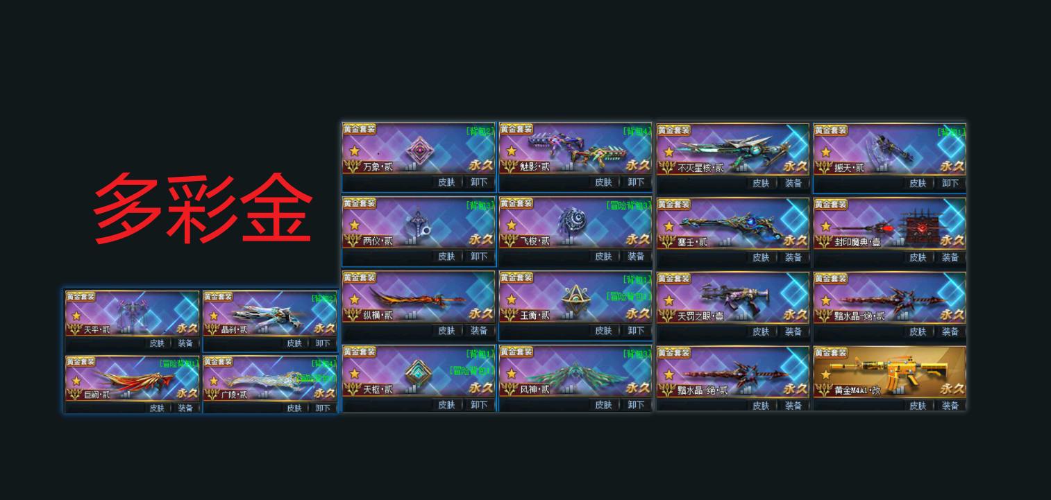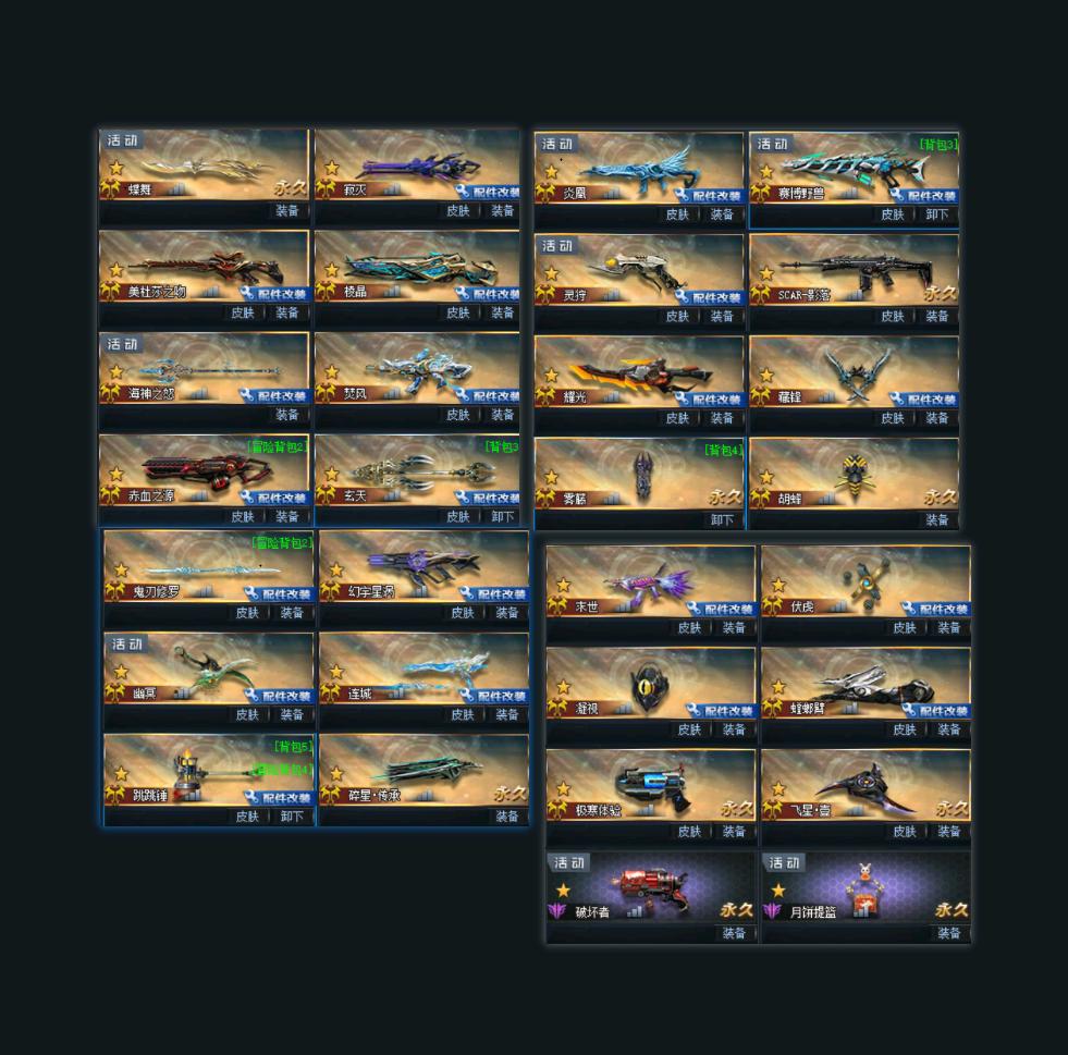 配件枪二配(幻锋(青龙皮肤)、玄天(万化皮肤)、凝视(一四配件,变异爽抓)、奏鸣、乾坤、耀光、藏锋、螳螂臂等)