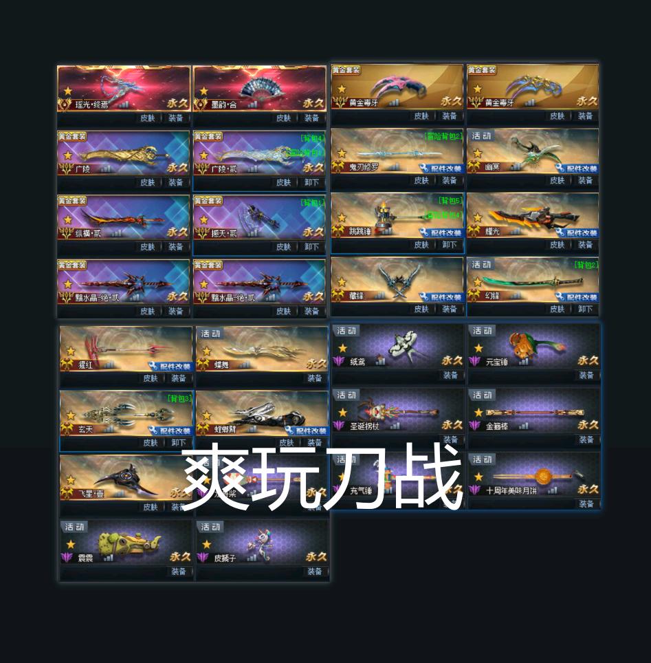 ✔️刀战用刀(流影壹、瑶光终焉、广陵贰(蓬莱皮肤)、纵横贰、二配幻锋(青龙皮肤)、撼天贰、满配鬼刃修罗(细雪皮肤)、满配幽冥(无极皮肤)、四配跳跳锤、二配玄天(万化皮肤)、两把暗水晶贰、二配耀光、二配藏锋、二配螳螂臂、飞星壹、充气锤、元宝锤、纸鸢、蝴蝶刀)