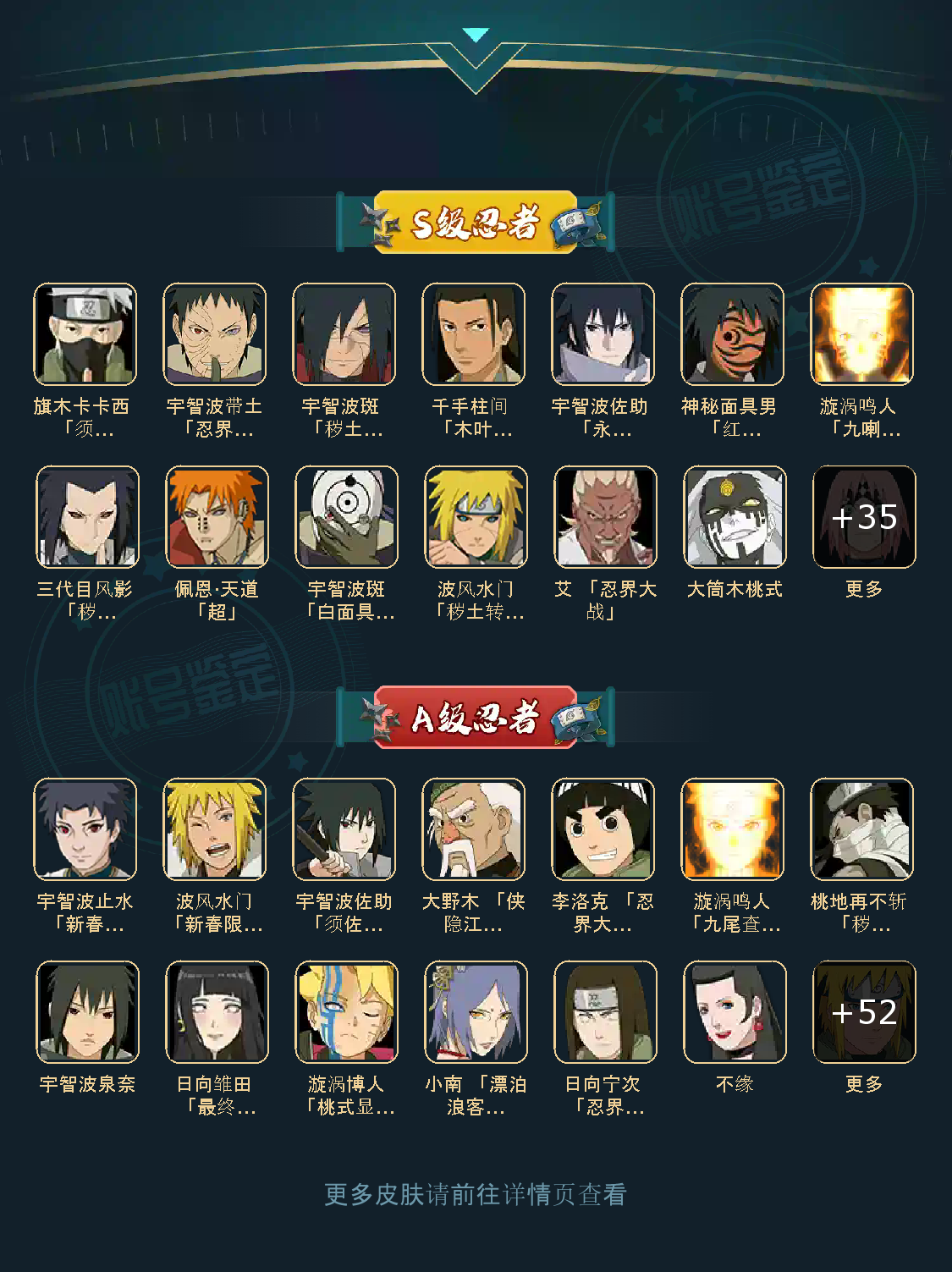 战力:2557W+;VIP14级;S忍47个;A忍58个,通灵兽28个,S忍:5星仙人模式自来也,5星纲手(普通),5星波风水门(普通),5星猿飞日斩(普通),4星自来也(普通),4星大蛇丸,4星秽土转生波风水门,4星神秘面具男(普通),4星三代目土影大野木,九喇嘛连结漩涡鸣人,永恒万花筒宇智波佐助,忍界大战春野樱,舞之豪杰自来也,百豪纲手,死门迈特凯,秽土转生猿飞日斩,秽土转生千手扉间,千手扉间(普通),千手柱间(普通),木叶创立千手柱间,秽土转生千手柱间,秽土转生宇智波斑,宇智波斑(普通),木叶创立宇智波斑,秽土转生解宇智波斑,须佐能乎宇智波鼬,秽土转生宇智波鼬,白面具宇智波斑,忍界大战宇智波带土,红夜之刃神秘面具男,四代目风影罗砂,秽土转生三代目风影,二代目水影鬼灯幻月,四代目雷影艾,三代目雷影艾,秽土转生金角银角,秽土转生半藏,忍界大战大野木,二代目土影无,天道佩恩,超佩恩天道,秽土转生长门,仙人模式药师兜,大筒木桃式,博人传大筒木金式, ;A忍:5星猿飞阿斯玛(普通),5星干柿鬼鲛(普通),5星迈特凯(普通),5星蝎(普通),5星死司凭血飞段,4星飞段(普通),3星疾风传我爱罗,3星宇智波止水(普通),3星宇智波鼬(普通),3星忍界大战我爱罗,忍者之路神秘面具男,万花筒写轮眼宇智波佐助,须佐能乎宇智波佐助,九尾查克拉漩涡鸣人,仙人模式漩涡鸣人,最终章日向雏田,地陆,志村团藏,忍界大战勘九郎,忍界大战奇拉比,奇拉比(普通),青年艾,火影继承人猿飞日斩,近松十人卫千代,忍界大战日向宁次,惊门迈特凯,旗木卡卡西(普通),秽土转生猿飞阿斯玛,百豪春野樱,万花筒写轮眼旗木卡卡西,新春限定波风水门,忍界大战秋道丁次,青年波风水门,五代目水影照美冥,新春限定宇智波止水,不风,青年长门,晓创生角都,晓大蛇丸,新春限定宇智波鼬,木叶上忍猿飞木叶丸,角都(普通),地怨虞角都,加藤断,火之意志继承者卑留呼,侠隐江湖纲手,新春限定小南,秽土转生迪达拉