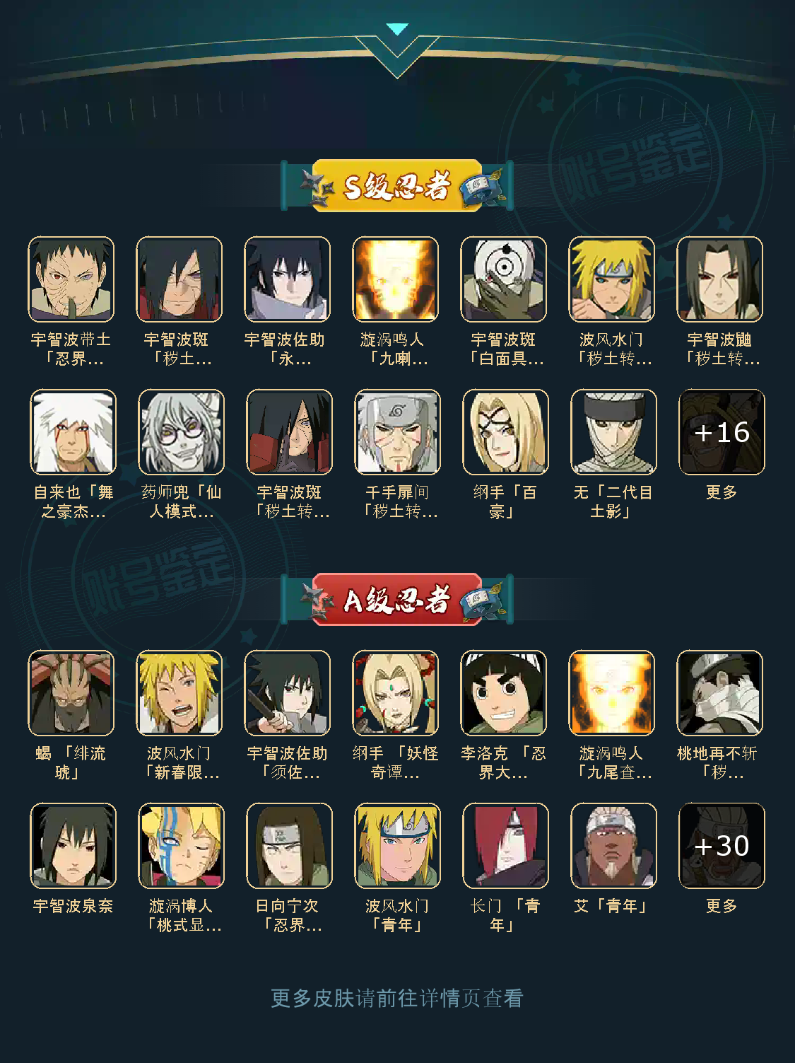 战力:1257W+;S忍27个;A忍34个,通灵兽19个,S忍:普通纲手波风水门九喇嘛鸣人永恒万花筒佐助普通自来也大蛇丸百豪纲手秽土水门猿飞日斩豪杰自来也秽土猿飞秽土扉间千手扉间千手柱间宇智波斑秽土解斑须佐鼬秽土鼬神秘面具男白面具忍战带土鬼