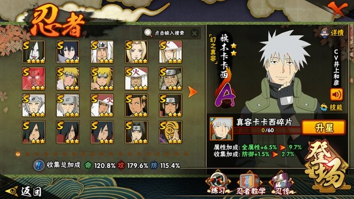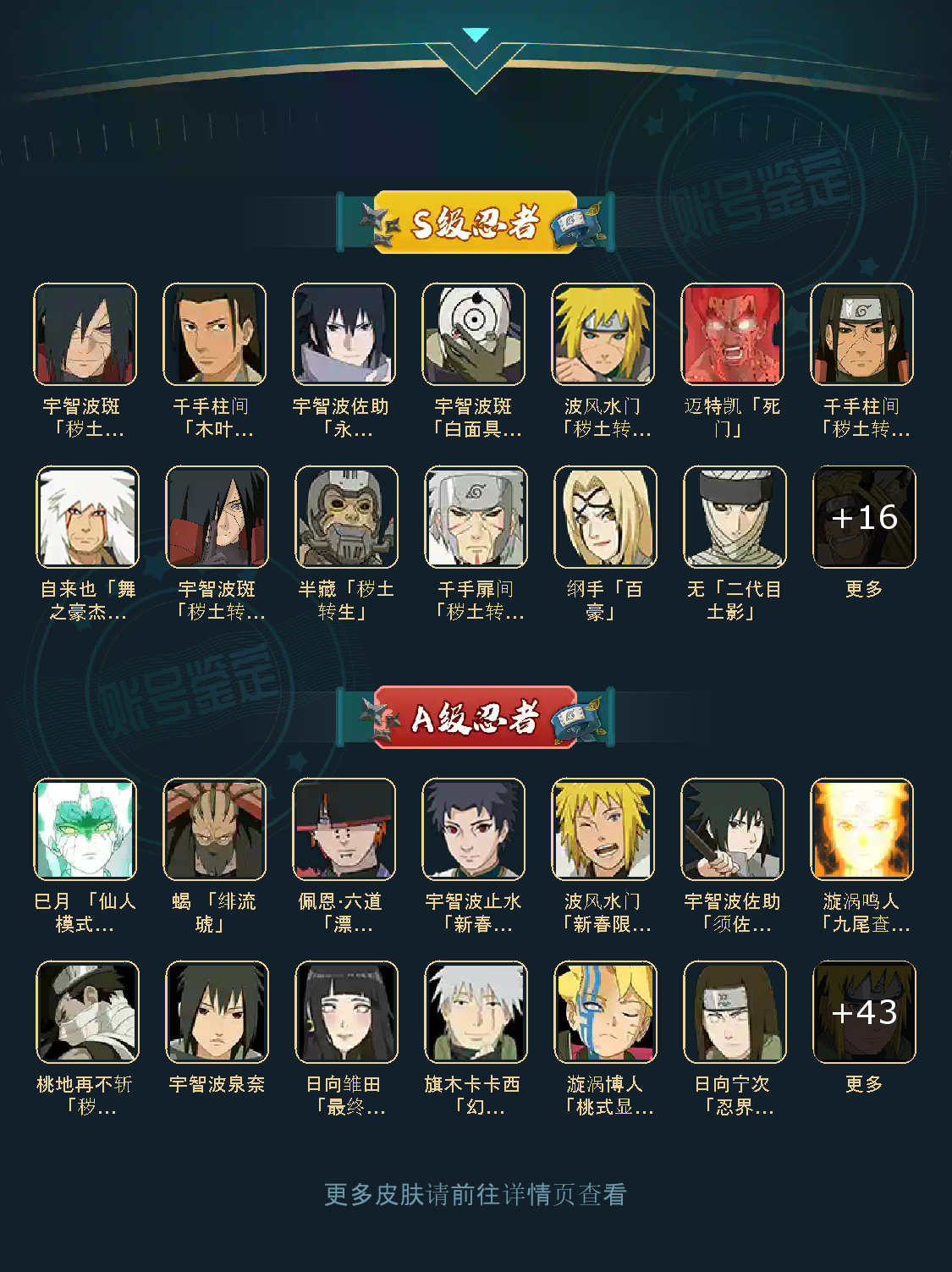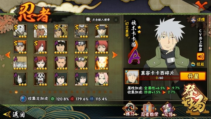 战力:1243W+;VIP12级;S忍27个;A忍49个,通灵兽20个,S忍:大蛇丸永恒万花筒佐助普通自来也百豪纲手普通纲手死门凯波风水门秽土水门秽土猿飞猿飞日斩秽土扉间千手扉间千手柱间秽土柱间木叶创立柱间秽土斑宇智波斑秽土解斑须佐鼬神秘面