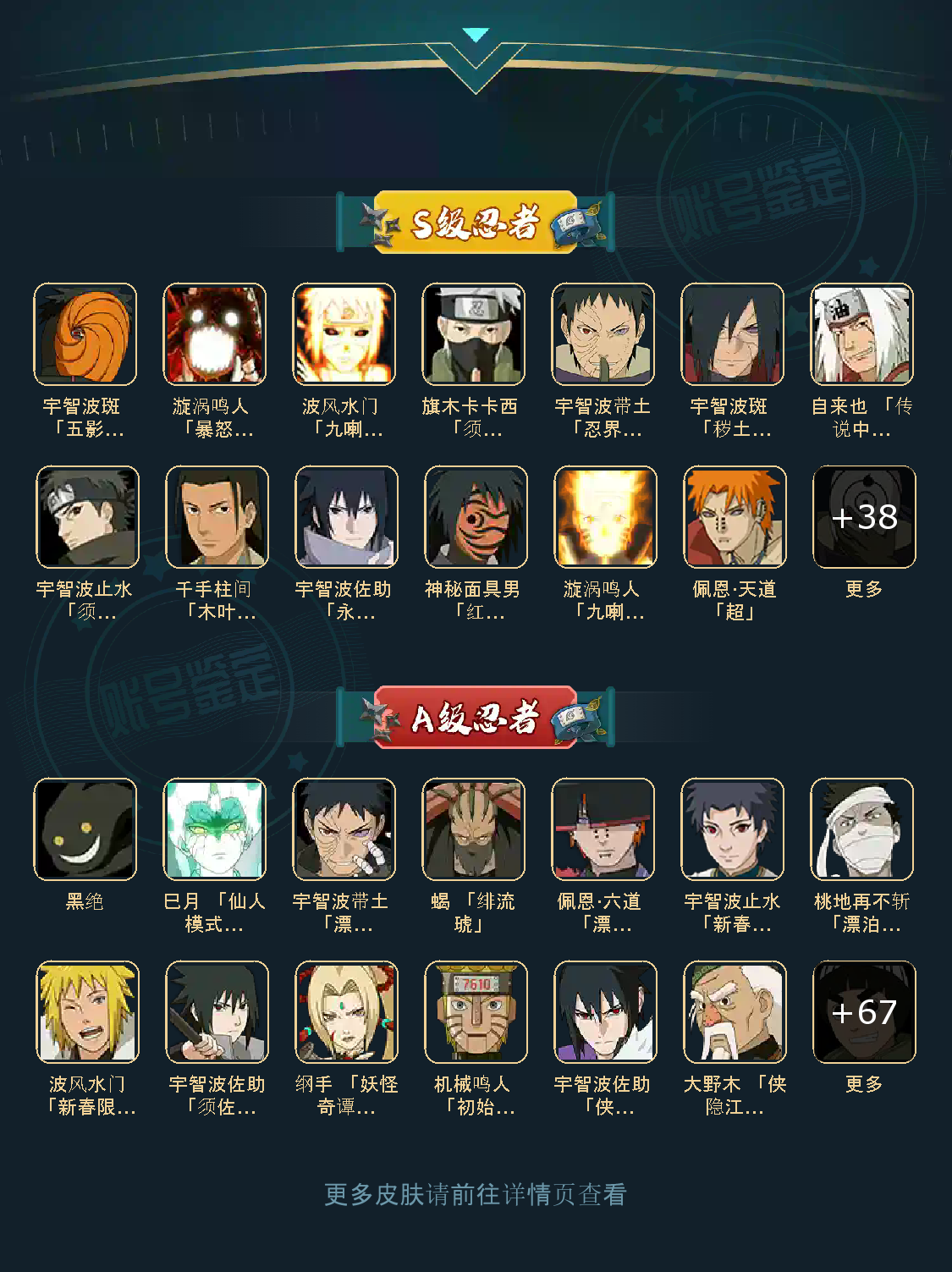 白面具 须佐卡卡西 小胡子鬼灯幻月 雷影 土影 无 佩恩 百战佩恩 青年柱间 创立初代 秽土斑 青年斑 解斑 须佐止水 虎皮 破面带土 红夜带土 罗砂 秽土三代风影 忍战雷影 三代雷影 金角银角 秽土半藏 忍战大野木 小土豆 天道超 大筒木桃式 大筒木金式 钢铁之躯凯 桀骜之刃阿斯玛 狂野之鲨鬼鲛 飞段 黑飞段 百豪樱 忍战李 大卡卡西 五代水影照美冥 宇智波鼬 仙鸣 九尾查克拉鸣人 樱佐 奇拉比 青年艾 半蛇兜 晓蛇 新春鼬 面麻 须佐佐助 疾风咒印佐助 忍战宁次 忍战天天 最终章雏田 幻容卡卡西 神卡 忍战卡卡西 泳装卡卡西 忍战凯 青春哥 惊门凯 爱情哥 新春止水 新春水门 青年水门 青水 新春我爱罗 泳装照美冥 侠隐照美冥 侠隐纲手 侠隐兜 漂泊再不斩 漂泊佩恩 漂泊二代 漂泊小南 漂泊佩恩 三船 青年三船 青年长门 泳装南 新春南 黑绝 新春大蛇丸 晓创生角度 晓创生蝎 晓创生飞段 泳装鼬 鲛肌融合鬼鲛 新春迪达拉 秽土迪达拉 恶灵之影飞段 暴怒带土 忍战黄土 卑留呼 桃博 黑土