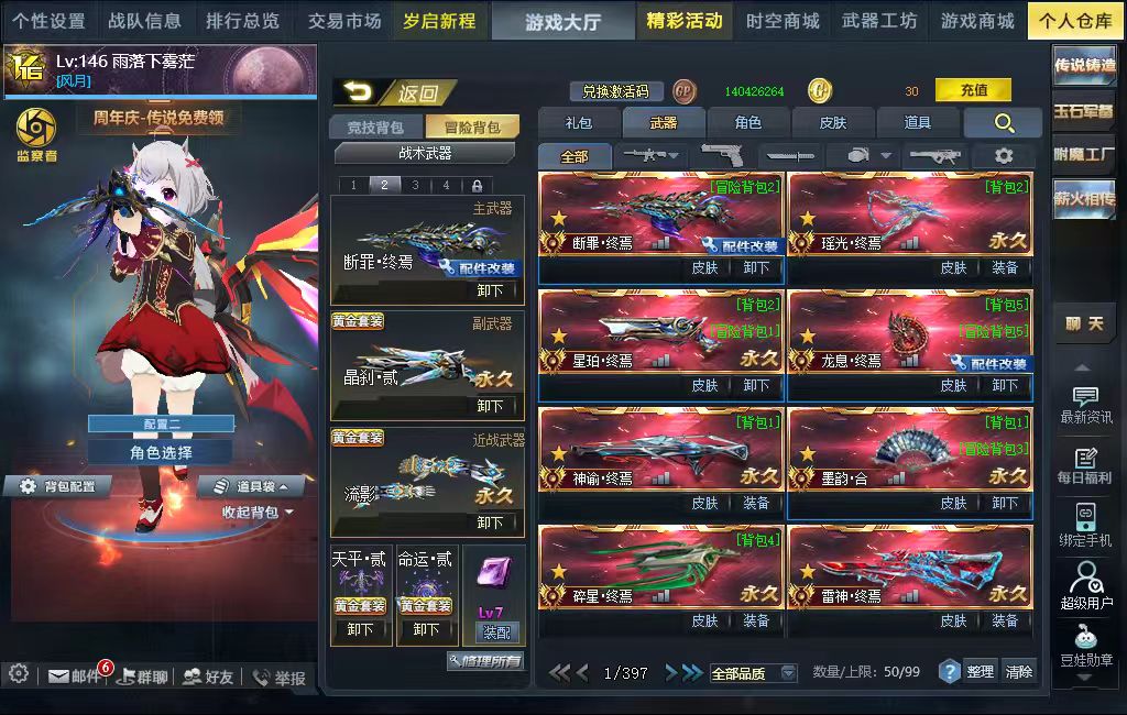 传说武器:断罪·终焉◆瑶光·终焉◆星珀·终焉◆RPK主宰◆龙息·终焉◆神谕·终焉◆AK47主宰◆墨韵·合◆碎星·终焉◆雷神·终焉◆SCAR-影魔◆无尽光影·终焉◆M4A1无限EX◆屠魔◆AK47天神◆万化主宰