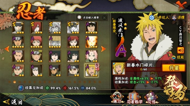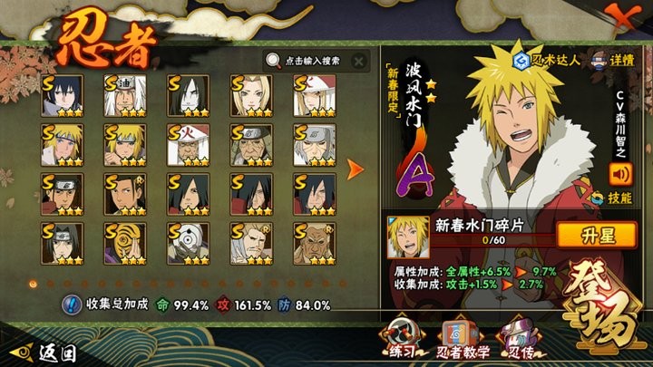 战力:1174W+;VIP12级;S忍24个;A忍39个,通灵兽21个,S忍:永恒万花筒佐助普通自来也大蛇丸百豪纲手普通纲手波风水门秽土水门猿飞日斩秽土猿飞秽土扉间千手柱间木叶创立柱间秽土斑宇智波斑秽土解斑须佐鼬神秘面具男白面具鬼灯幻月三代