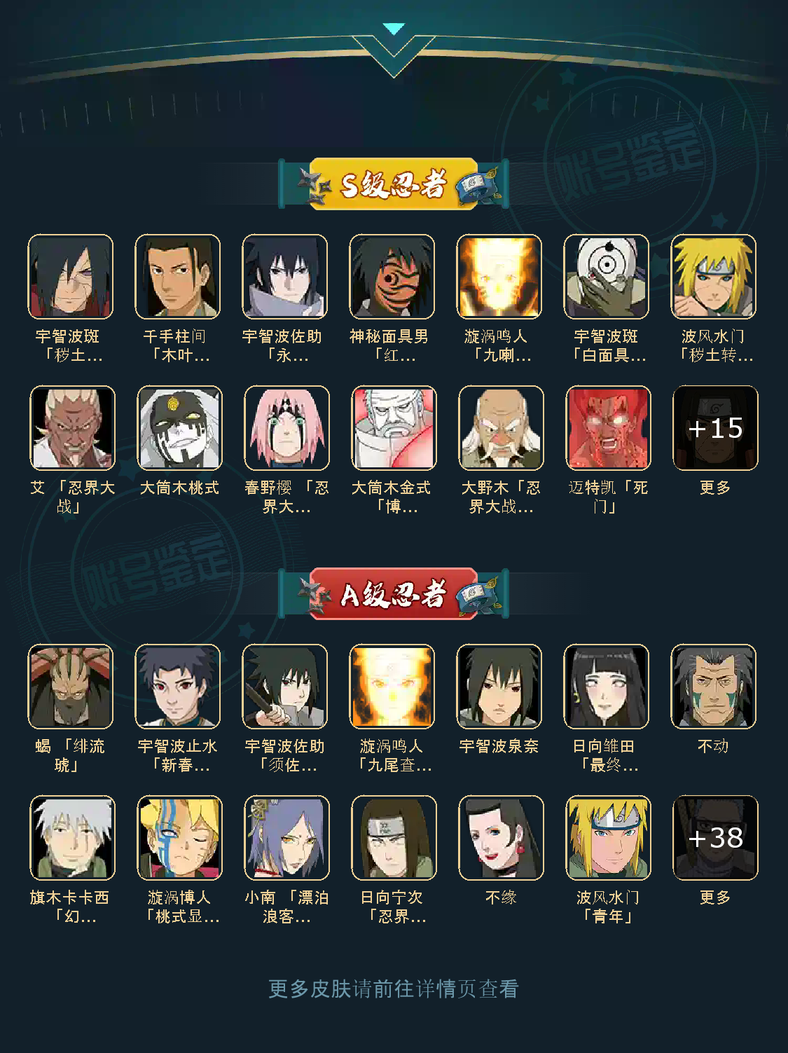 战力:1216W+;VIP11级;S忍24个;A忍45个,通灵兽18个,S忍:九喇嘛鸣人永恒万花筒佐助忍战樱普通自来也豪杰自来也大蛇丸百豪纲手普通纲手死门凯波风水门秽土水门秽土猿飞秽土扉间木叶创立柱间秽土柱间秽土斑秽土解斑白面具红夜面具男忍