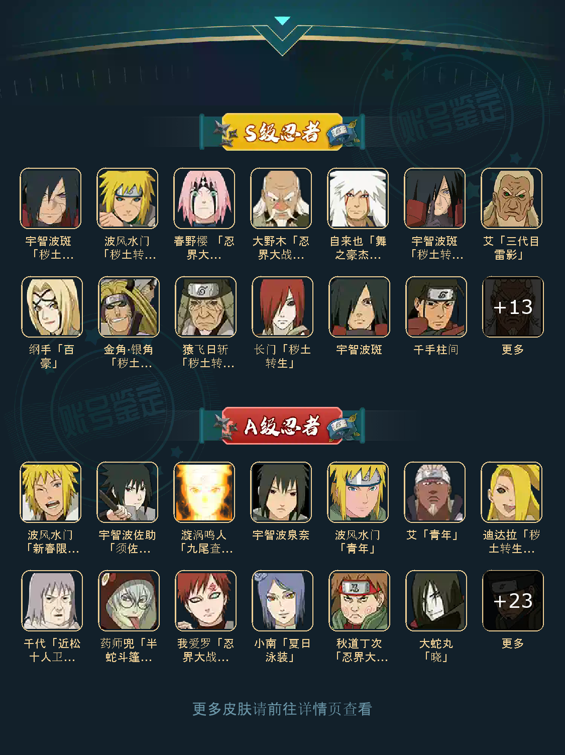 战力:1515W+;VIP11级;S忍24个;A忍33个,通灵兽22个,S忍:普通纲手猿飞日斩大蛇丸波风水门普通自来也仙人自来也百豪纲手秽土水门秽土猿飞豪杰自来也千手扉间千手柱间宇智波斑秽土斑秽土解斑须佐鼬神秘面具男鬼灯幻月四代艾三代艾金角