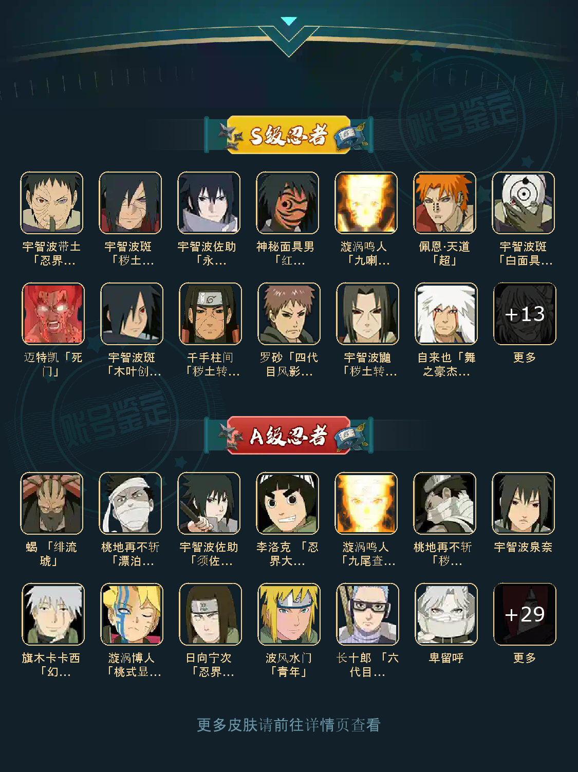 战力:1238W+;VIP11级;S忍24个;A忍33个,通灵兽19个,S忍:普通纲手猿飞日斩九喇嘛鸣人永恒万花筒佐助豪杰自来也大蛇丸死门凯波风水门秽土猿飞秽土柱间秽土斑木叶创立斑秽土解斑须佐鼬秽土鼬神秘面具男白面具忍战带土红夜面具男罗砂三