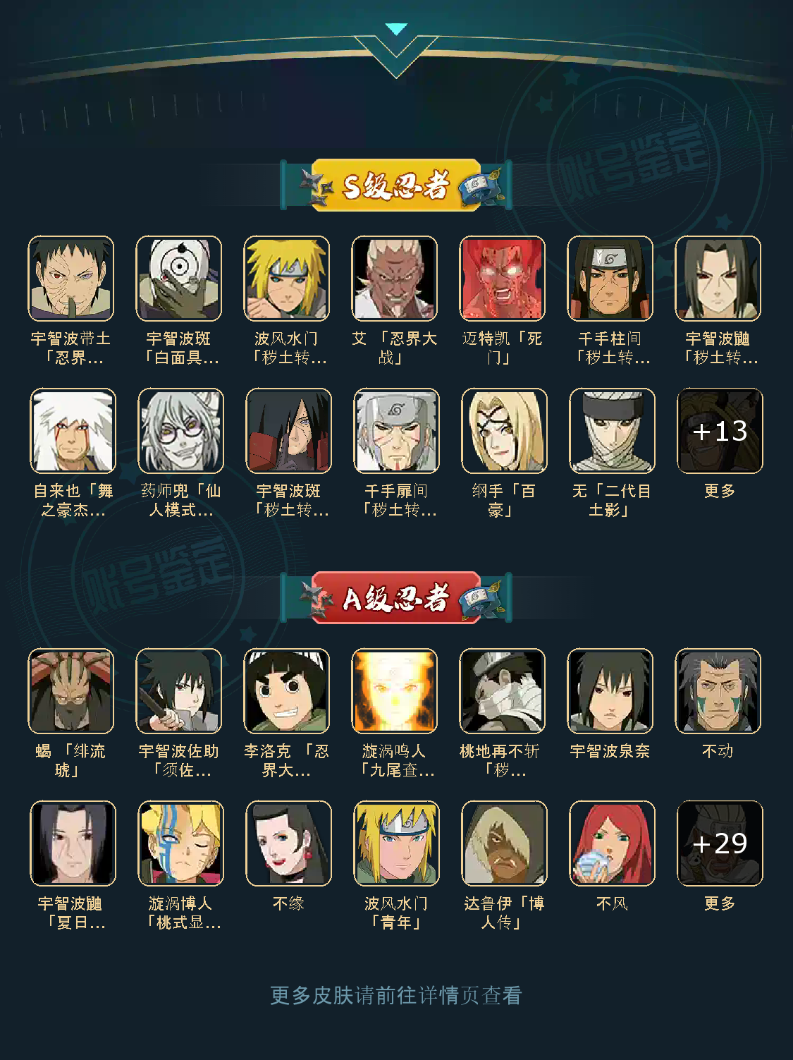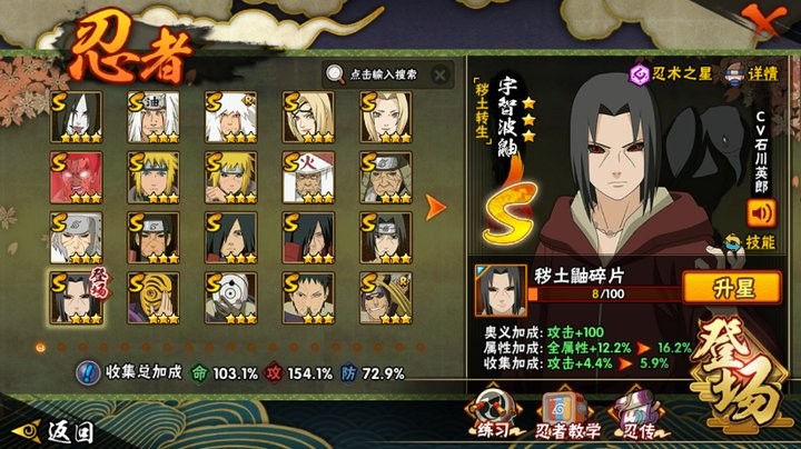 战力:1234W+;VIP8级;S忍23个;A忍34个,通灵兽18个,S忍:大蛇丸普通自来也豪杰自来也普通纲手百豪纲手死门凯波风水门秽土水门秽土猿飞猿飞日斩秽土扉间秽土柱间宇智波斑秽土斑须佐鼬秽土鼬神秘面具男白面具忍战带土金角银角二代土影无