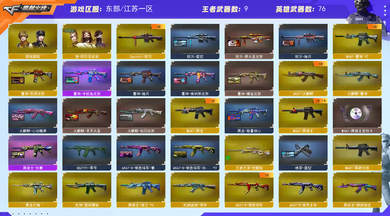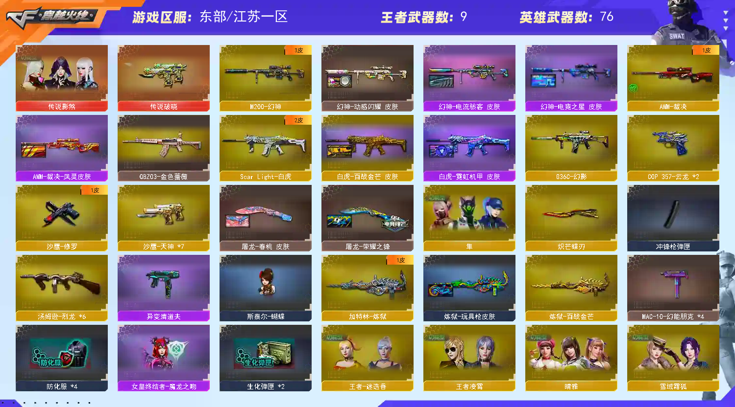 【主 武】:幻神(电流骇客)、G36C幻影、6烈蝴蝶、朱雀、Baarrett朱雀、白虎(霓虹)、青龙之魂、火麒麟(STAR)、黑龙(能量核心)、雷神(耀金)、黑骑士(白马银枪)、QB金色蔷薇、超新星热带奇洋、裁决、毁灭(星空)、王者之力、王者之决、炼狱、毁灭征服者、冰龙粉碎者、机甲撕裂者、激光毁灭者、圣炎切割者、深渊巨龙咆哮、神圣爆裂者、试炼破坏者、苍雷、金魔等各种活动武器