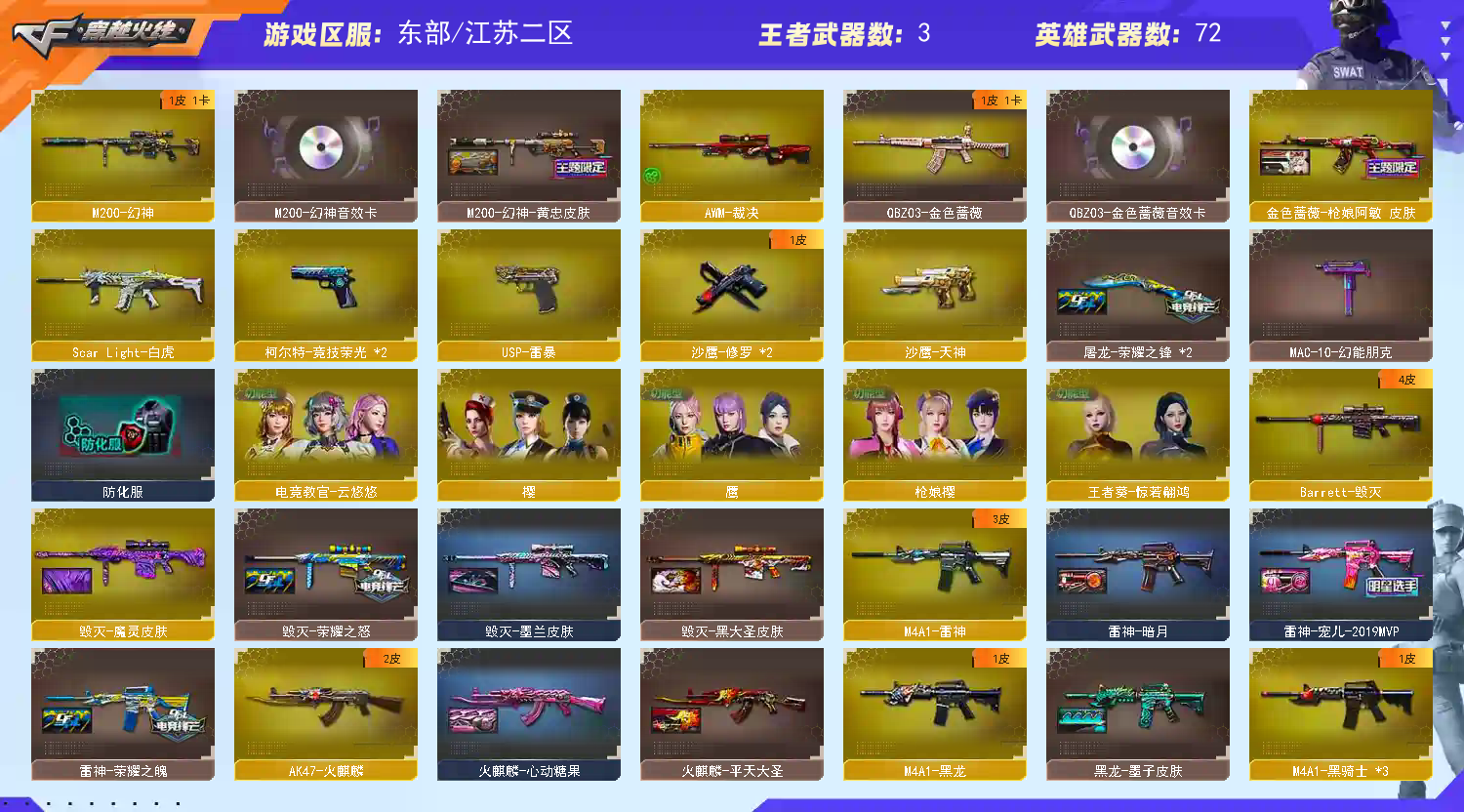 幻神黄忠/毁灭荣耀之怒/毁灭墨兰/毁灭魔灵/毁灭黑大圣/火麒麟平天大圣/火麒麟心动糖果/孙权/雷神宠儿2019MVP/雷神荣耀之魄/鹰/电竞教官-云悠悠/_樱/枪娘樱/M200-幻神/M200-竞技荣光/Barrett-毁灭/Barrett-暗月传说/AWM-天龙/竞技荣光套装/黄金次元之矛套装/超新星-热带奇洋音效卡/M4A1-雷神-动感闪耀音效/M200-幻神音效卡/QBZ03-金色蔷薇音效卡