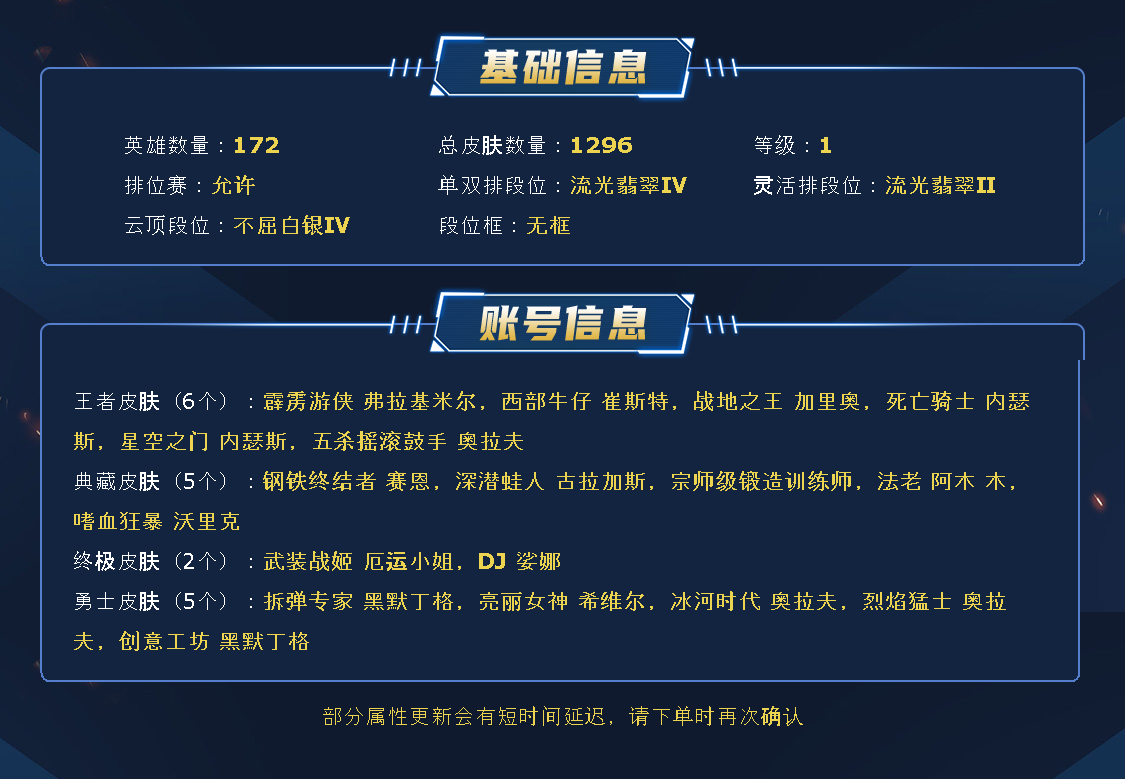 ~~喜欢记得收藏~~可排位~~1300皮全英雄~~租之前尽量查一下游戏ID,确保段位是您需要的,避免浪费您的时间~~请勿挂机逃跑故意送人头,谢谢合作,谢谢~~