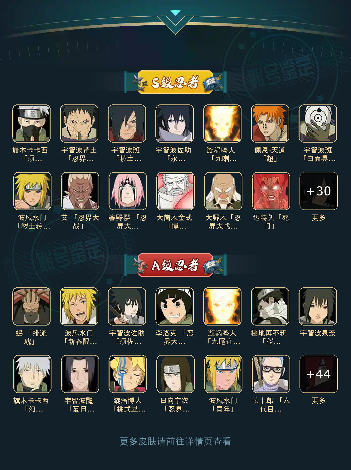艾「三代目雷影」(3星艾「三代目雷影」),波风水门(3星波风水门),无「二代目土影」(3星无「二代目土影」),千手扉间「秽土转生」(3星千手扉间「秽土转生」),半藏「秽土转生」(3星半藏「秽土转生」),千手扉间(3星千手扉间),宇智波斑(3星宇智波斑),药师兜「仙人模式」(3星药师兜「仙人模式」),猿飞日斩(5星猿飞日斩),艾「忍界大战」(3星艾「忍界大战」),宇智波斑「秽土转生·解」(3星宇智波斑「秽土转生·解」),宇智波鼬「秽土转生」(3星宇智波鼬「秽土转生」),佩恩「天道」(3星佩恩「天道」)