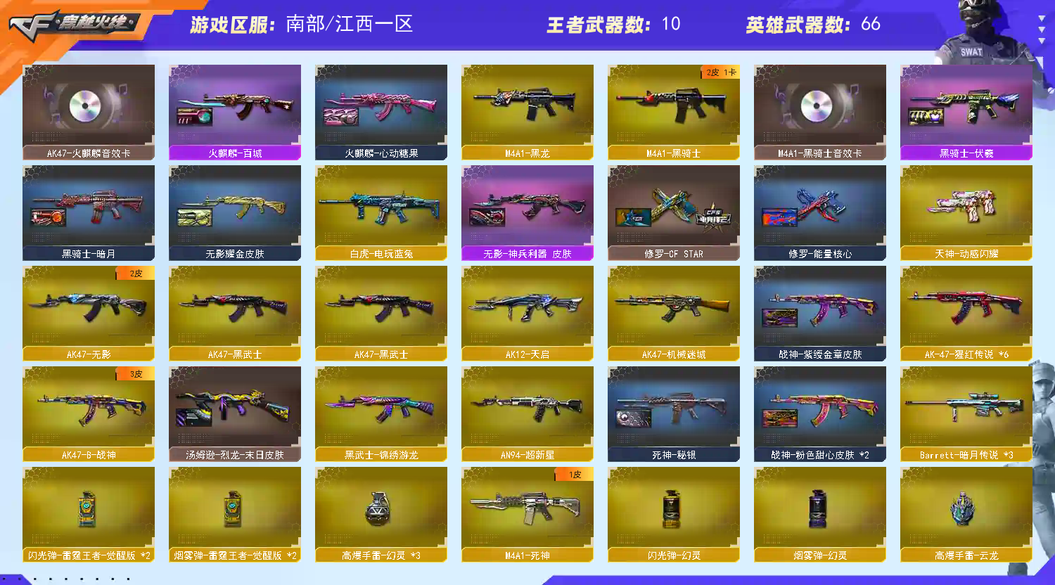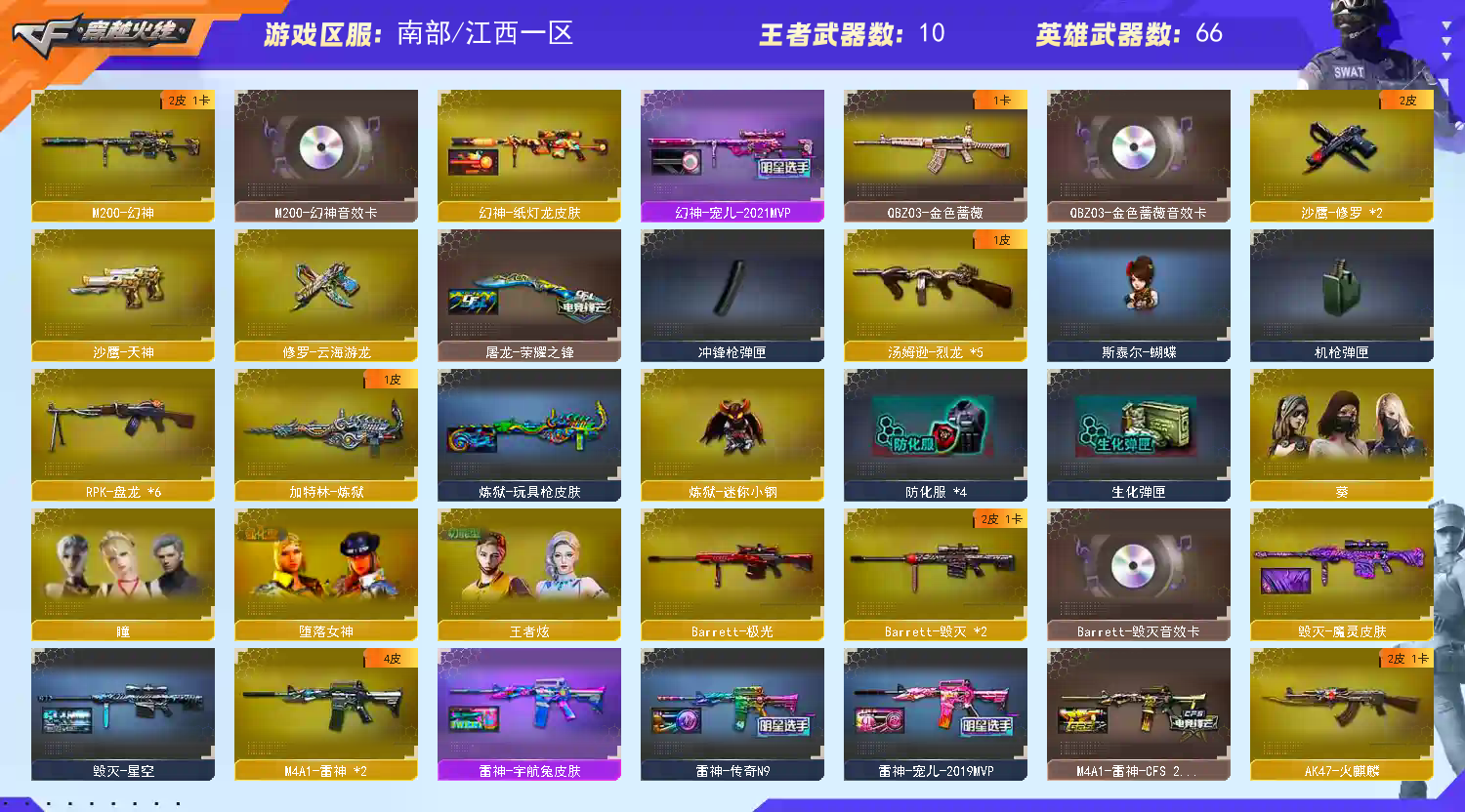 Lv.102荣耀元帅,10王者/0炫金/66英雄/CF点31580/【重要角色8】王者炫/堕落女神/角色-瞳/职业选手/角色-葵/铁骑荣耀/青霞仙子/甜心偶像【王者武器8】c-觉醒版/高爆手雷-雷霆王者*3/烟雾弹-雷霆王者-觉醒版*2/闪光弹-雷霆王者-觉醒版*2【热门武器20】M200-幻神/炼狱-迷你小钢/斯泰尔-蝴蝶/死亡之眼/5烈龙/6盘龙/2修罗/炼狱/金刚伞-电玩红兔/M200-庆典-CFS2021【英雄武器65】AN94-超新星/AK-47-猩红传说*6/QBZ03-金色蔷薇/AK47-机械迷城/白虎-电玩蓝兔/AK47-B-战神/超新星-热带奇洋/AK12-天启/黑武士-锦绣游龙/M4A1-黑龙/烈火-动感闪耀/AK47-无影/M4A1-黑骑士/M4A1-死神/M4A1-雷神*2/AK47-火麒麟/AK47-黑武士/Barrett-暗月传说*3/Barrett-极光/Barrett-毁灭*2/AWM-天龙/M200-幻神/汤姆逊-烈龙*5/烈龙-云海游龙/RPK-盘龙*6/加特林-炼狱/擎天-云海游龙/龙啸/屠龙-动感闪耀/擎天/麒麟刺/屠龙/高爆手雷-幻灵*3/烟雾弹-幻灵/手雷-动感闪耀/闪光弹-幻灵/烟雾弹-云龙*2/手雷-热带奇洋/高爆手雷-云龙/天神-动感闪耀/修罗-云海游龙/沙鹰-修罗*2/沙鹰-天神【热门皮肤17】幻神-纸灯龙/幻神-宠儿-2021MVP/M4A1-雷神-CFS2019/雷神-宠儿-2019MVP/雷神-传奇N9/黑骑士-伏羲/天龙-CFSTAR/火麒麟-CFSTAR/修罗-CFSTAR/修罗-CFSTAR/雷神-宇航兔/无影耀金/屠龙-荣耀之锋/火麒麟-百城/毁灭-星空/火麒麟-心动糖果/麒麟刺-月【人偶武器14】斯泰尔-蝴蝶/炼狱-迷你小钢/迷你深渊冰龙/M4A1-雷神-精英刀锋/COP-旗袍/迷你裂空之翼/迷你波特博士*2/夺魂/生化手雷-机甲核心*2/深渊终结者手雷*2/COP-白鲨【暴走生化武器14】斯泰尔-蝴蝶/炼狱-迷你小钢/死亡之眼/汤姆逊-烈龙*5/RPK-盘龙*6【挑战武器8】M4A1-黑骑士/神圣爆裂者-末日III/激光毁灭者I/激光毁灭者III/试炼破坏者III/冰龙粉碎者-白马银枪*3【音效卡武器6】M4A1-黑骑士音效卡/QBZ03-金色蔷薇音效卡/Barrett-毁灭音效卡/AK47-火麒麟音效卡/M200-幻神音效卡/天神-动感闪耀音效卡【普通皮肤13】毁灭-魔灵/战神-粉色甜心*2/AK47-B-常胜将军-曹操/战神-紫绶金章/黑骑士-暗月/AK47-B-常胜将军-孙权/黑龙-暗月/修罗-能量核心/AK-47-雷神/汤姆逊-烈龙-末日/无影-神兵利器/麒麟刺-萌杀【光效6】Kar98K-星神紫橙光效/M4A1-死神蓝色光效/汤姆逊-烈龙蓝色光效/M200-幻神蓝粉色光效/M4A1-雷神紫橙光效/屠龙蓝粉色光效【玩偶14】夏日玩偶/波特博士玩偶饰品_红色/末日机甲玩偶/深渊黑龙玩偶/火麒麟玩偶/战舰玩偶/电磁巨兽玩偶/深渊冰龙玩偶/终结者玩偶/三国-蜀国玩偶/曼陀罗玩偶/马超玩偶/15周年玩偶/王者蝴蝶-保卫者玩偶【戒指武器17】22赛季纪念戒指-耀银(拇指)/22赛季纪念戒指-耀银(食指)/23赛季纪念戒指-耀铜(食指)/23赛季纪念戒指-耀银(拇指)/龙眼(鹰)/龙眼(死神)/21赛季纪念戒指-耀银(拇指)/17赛季纪念戒指-耀银/16赛季纪念戒指-枪王耀银/18赛季纪念戒指-耀金/20赛季纪念戒指-耀金/8周年戒2/24赛季纪念戒指-耀银(食指)/24赛季纪念戒指-耀银(拇指)/15周年限定戒指/25赛季纪念戒指-耀银(食指)/25赛季纪念戒指-耀银(拇指)