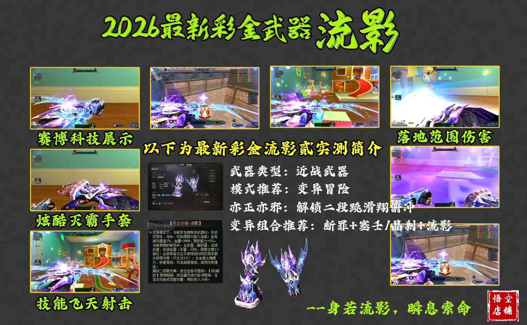 【英雄配件武器】: 浮光 曜弦 崩雷 伯言 渊瞳 归墟血契 星斗 天际 寂灭 月隐 奏鸣 鬼刃修罗 藤木蔓芯 幻宇星涡 尘埃 绝境 弧光 跳跳锤 核子裂变 迷你派拉 裂隙行者 伏虎 盖亚 赛博野兽 玄天 灵狩 不朽 终末之弩 寂静白龙 花束 原石之力(可原地复活) 原石之怒 幻锋 螳螂臂 浪淘沙 翎羽 风暴 破空 英勇比伯 陷阵 无踪 冰河 猎犬 霓虹旋风 禁止通行 极寒体验 等等