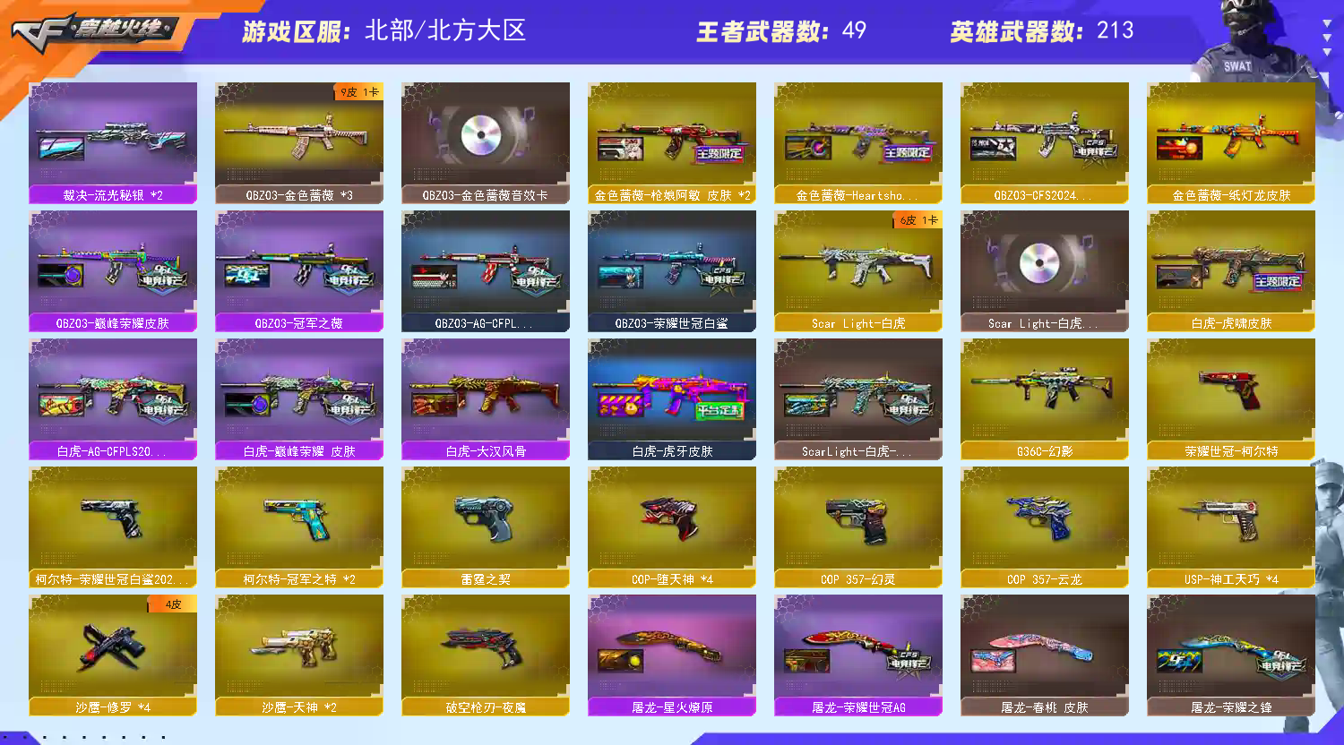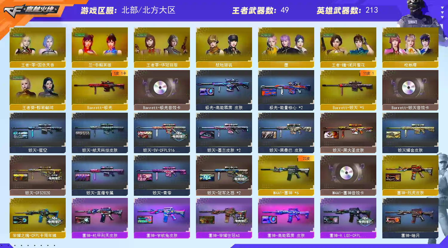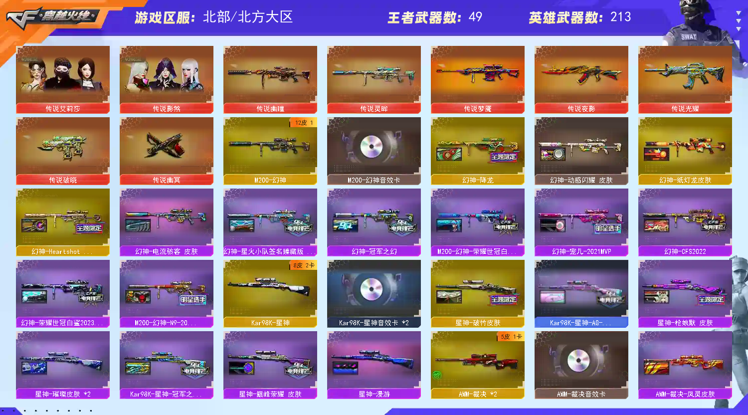 【四防传说艾莉沙】 【四防传说影煞】 【传说幽瞳】 【传说灵眸】 【m200幻神+音效卡+幻神-冠军之幻+幻神-宠儿+n92022mvp+电流骇客+降龙+heartshot+纸灯龙+荣耀世冠白鲨+幻神-荣耀世冠白鲨2023+幻神星火小队+cfs2022+动感闪耀】 【98k星神+音效卡+星神-璀璨+冠军之星+漫游+呛娘+ag21冠军+巅峰荣耀】 【王者幻神】 【王者风神】 【王者星霆】 【传说梦魇】 【传说夜影】 【传说光耀】 【传说幽冥】 【传说破晓】 【g36c幻影】 【白虎之魄】 【王者白虎】 【白虎+音效卡+虎啸+巅峰荣耀+冠军之虎】 【夜魔套】 【堕天神套】 【神工天巧套】 【qbz金色蔷薇+音效卡+heartshot+纸灯龙+cfs2024+冠军之薇+荣耀世冠白鲨】 【火麒麟+音效卡+火麒麟-呛娘+火麒麟-荣耀世冠ag+火麒麟-even+火麒麟-冠军之心】 【黑龙+音效卡+黑龙-冠军之武】 【雷神+音效卡+heartshot+雷神-荣耀之魄-cfpl十周年臻藏版+雷神-荣耀世冠ag+雷神-lgd18冠军+雷神-宠儿+雷神-传奇n9+雷神-白鲨14冠军+雷神-荣耀之魄+雷神-冠军之魄】 【黑骑士+音效卡+白马银呛+黑骑士-冠军之势】 【毁灭+音效卡+heartshot+呛娘+毁灭-冠军之怒】 【极光+音效卡】 【裁决+音效卡】 【王者之心 王者之翼 王者之武 王者之魄 王者之势 王者冰魄 王者风势 王者雷影 王者之光】 【千变 无影 死神 黑武士 天启 超新星 青龙 hk417朱雀 玄武+音效卡 天罚 玫瑰精灵 烈火】 【生化 4盘龙 5炼狱 6烈龙 蝴蝶刀 迷你小钢 双面神 mk5炽火炎龙 毒蜂 异变清道夫 斯泰尔呛娘暗刃 隼 影煞】 【26手呛 修罗*4 天神*2 cop雷霆 cop堕天神*4 cop幻灵 usp神工天巧*4 王者之魂 cop云龙 冠军之特*2 柯尔特荣耀世冠白鲨2023】 【30近战 冠军之刃*3 屠龙*3 龙啸*2 擎天 麒麟刺*3 斩神刀雷暴 幻灵之锋 炽芒蝶刃蝴蝶刀*2+冠军炽芒 王者之锋 王者之啸*3 王者之击 王者玉锋 黄金猫猫手套白鲨】 【手雷*21 雷霆雷 雷暴雷 堕天神雷*6 夜魔雷*5 幻灵雷 神工天巧雷*6】 【四防角色 呛娘樱 晴雅 王者春 王者葵貂蝉 王者零国色天香 王者迷迭香 王者葵惊若翩鸿 王者零华冠丽服 王者凌霄 王者潘多拉 王者沙漠玫瑰 隼 女主播】 【角色 关小雨 兰巾帼英雄 零 迷迭香 奇洋探员 乔伊教练 司雨 王者瞳闭月羞花 新海豹突击队 鹰 云海玲珑 炫 魅影】 【幻神音效卡 星神音效卡 玄武音效卡 白虎音效卡 黑龙音效卡 极光音效卡 火麒麟音效卡 裁决音效卡 金色蔷薇音效卡 黑骑士音效卡 火麒麟音效卡 毁灭音效卡】 【臻选金狐套 臻选次元套】