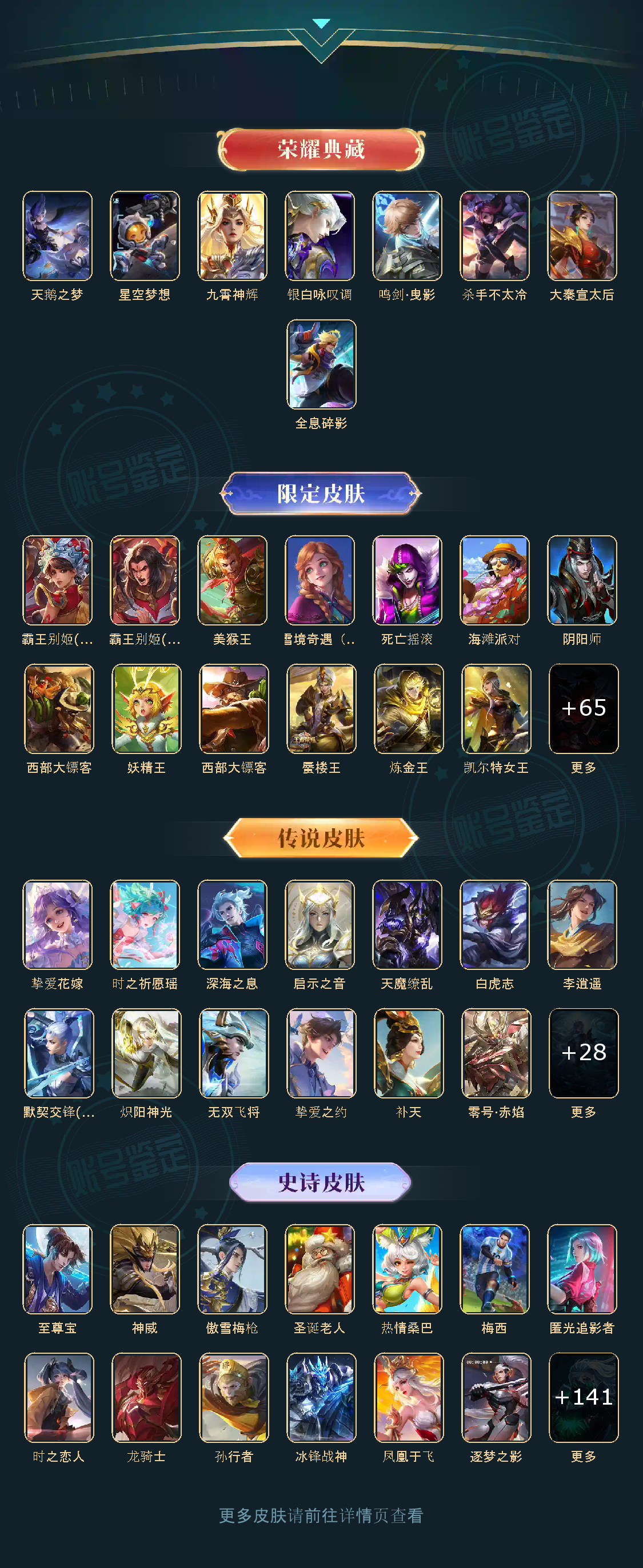 天鹅之梦,星空梦想,鸣剑·曳影,九霄神辉,银白咏叹调,天魔缭乱,白虎志,李逍遥,默契交锋(花木兰),零号·赤焰,炽阳神光,圣诞老人,热情桑巴,梅西,至尊宝,神威,匿光追影者,无双飞将,时之祈愿瑶,挚爱之约,挚爱花嫁,深海之息,补天,启示之音,傲雪梅枪