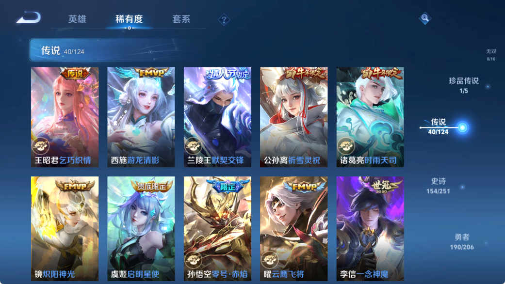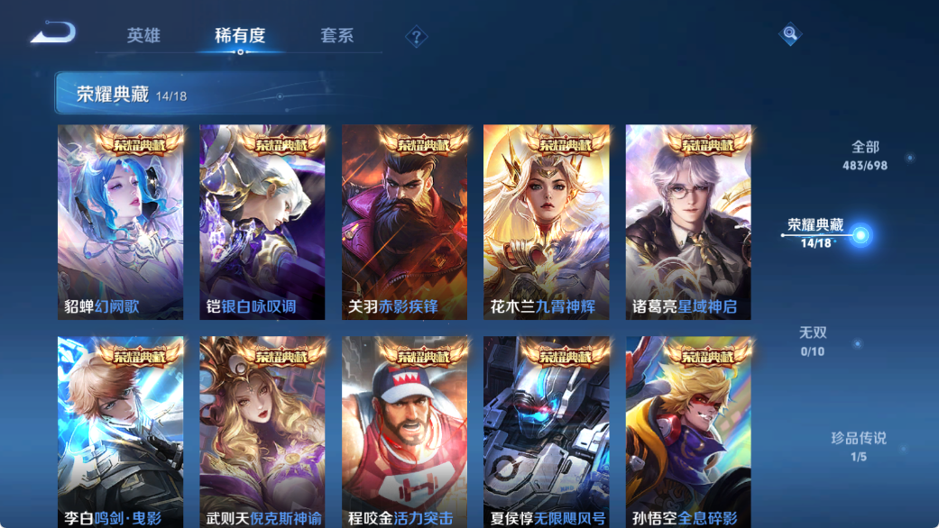 天鹅之梦,星空梦想,无限飓风号,鸣剑·曳影,赤影疾锋,星域神启,幻阙歌,九霄神辉,银白咏叹调,天魔缭乱,白虎志,默契交锋(兰陵王),默契交锋(花木兰),零号·赤焰,炽阳神光,热情桑巴,梅西,乘龙·忆丹青,至尊宝,神威,纯白花嫁,匿光追影者,时之奇旅(大乔),无双飞将,时之祈愿瑶,挚爱之约,挚爱花嫁,器灵·落星盏,至美·乘鲤谣,曦玄引(貂蝉),傲雪梅枪