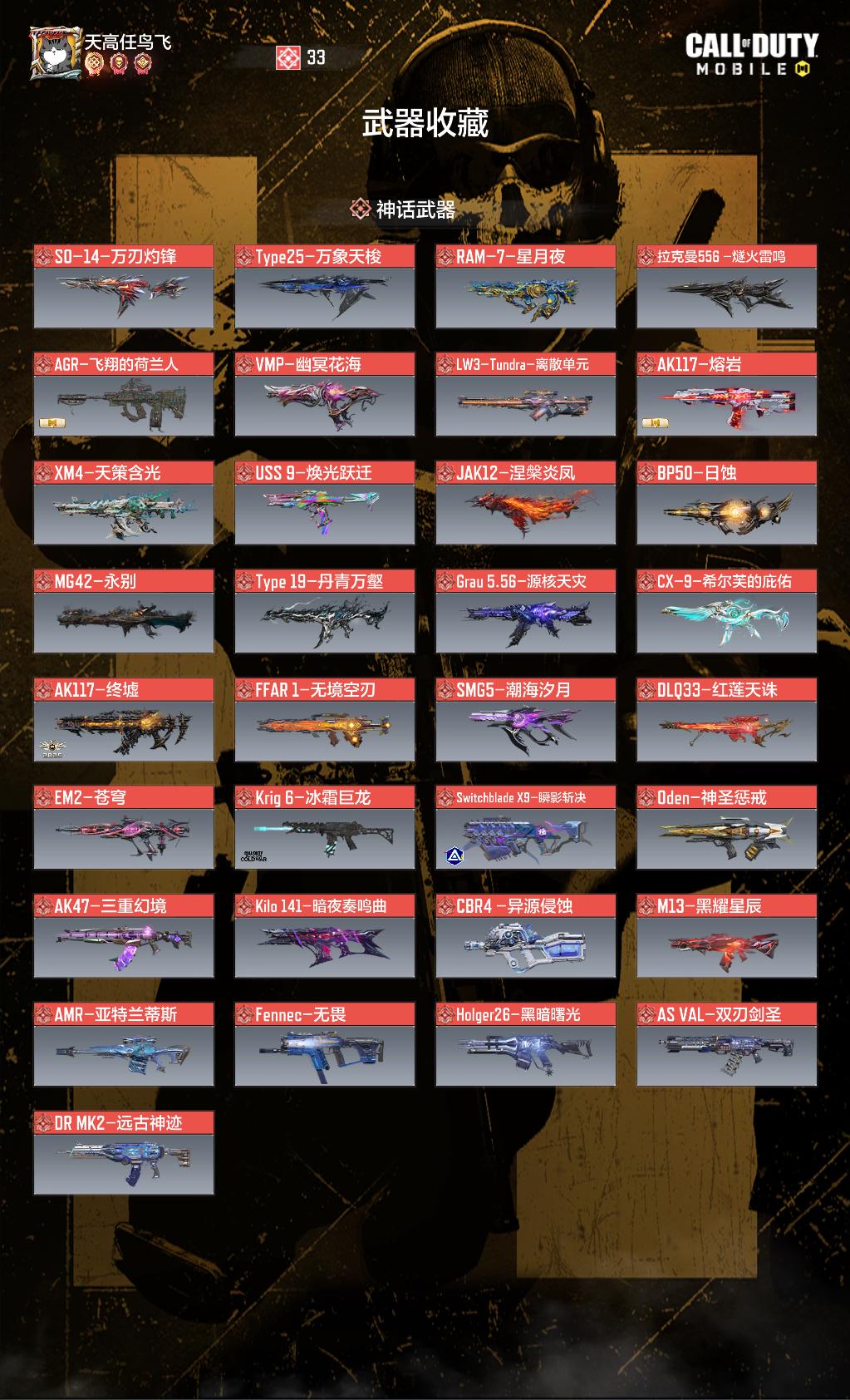 EM2-苍穹 Krig6-冰霜巨龙 SwitchbladeX9-瞬影斩决 Oden-神圣惩戒 AK47-三重幻境 Kilo141-暗夜奏鸣曲 CBR4-异源侵蚀 M13-黑耀星辰 AMR-亚特兰蒂斯 Fennec-无畏 Holger26-黑暗曙光 AS VAL-双刃剑圣 DR MK2-远古神迹 AK117-熔岩