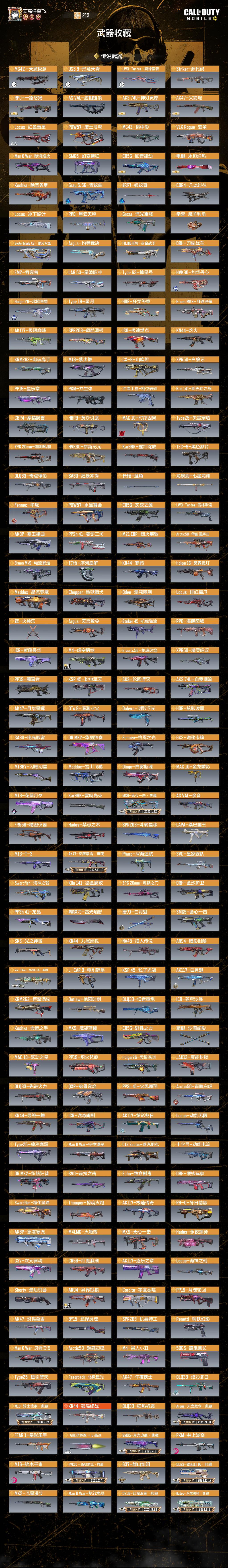 MG42-天魔极意、USS 9-形意天青、LW3-Tundra-瞬蜂强袭、Striker-源代码、RPD-一路悠扬、AS VAL-虚相连锁、AKS74U-神灯灵愿、AK47-火箭炮、Locus-红色彗星、PDW57-废土弓弩、MG42-镜中影、VLK Rogue-变革、Man O War-狱海焰火、SMG5-幻变迷狂、CR56-回音律动、电棍-永恒炽热、Koshka-除恶务尽、Grau 5.56-青蛇曲、蛇刃-银蛇舞、CBR4-凡此过往、Locus-冰下诡计、RPD-星云天秤、Groza-流光宝瓶、拳套-魔羊利角、Switchblade X9-银河双鱼、Argus-均等裁决、FHJ18毒刺-赤金战矛、DRH-刀轮战车、EM2-吞噬者、LAG 53-星隙脉冲、Type 63-掠星号、HVK30-灼华丹心、Holger26-北境恒星、Type 19-星河、HDR-狂笑终章、Bruen MK9-月球巡航、AK117-极限巅峰、SPR208-飙酷滑板、ISO-极速燃点、KN44-灼火、KRM262-电玩高手、M13-紫炎舞、CX-9-山吹烬、XPR50-白狼牙、PP19-星乐章、PKM-共生体、冲锋手枪-相位破碎、Kilo 141-斯巴达之怒、CBR4-柔情鳄兽、HBR3-黄沙引渡、MAC 10-时序因果、Type25-矢量穿透、ZRG 20mm-咖啡风潮、HVK30-崭新纪元、Kar98K-猩红绽放、TEC-9-黑色默片、DLQ33-奇点悖论、SA80-狂暴冲锋、长枪-涯角、龙泉剑-七星龙渊、Fennec-华珑、PDW57-水晶舞会、CR56-灰烬之源、LW3-Tundra-雪林歌谣、AKBP-塞壬律曲、PPSh 41-姜饼工坊、M21 EBR-烈火疾驰、Arctic50-华丽圆舞曲、Bruen Mk9-电流暴走、钉枪-序列崩解、KN44-寒鸦、Holger26-冥界提灯、Maddox-晶流梦魇、Chopper-地狱猎犬、Oden-混沌棘刺、Locus-绯红猫爪、钗-火神乐、Argus-天宫敕令、Striker 45-机骸骇浪、RPD-海民图腾、ICR-紫藤曼华、M4-虚空坍缩、Grau 5.56-龙魂怒焰、XPR50-精灵咏叹、PP19-蔑誓者、KSP 45-粉电擎天、SKS-轮回湮灭、AKS74U-自我潮流、AK47-月华星辉、OTs 9-深渊业火、Dobvra-渊影浮光、HDR-炫彩泼墨、SA80-电光骇客、DR MK2-华丽独奏、Fennec-终焉之光、GKS-诡秘卡牌 M1887-闪耀明星、Maddox-雪山飞驰、Dingo-白雾断魂、MAC 10-金龙鳞影、M13-花晨月夕、Kar98K-雷鸣光束、MX9-无心一击·典藏、AS VAL-余音、FR556-精密仪器、Hades-禁忌之术、SPR208-斗转星移、LAPA-桑巴国王、M16-T-3、AK47-炎舞霜雪·典藏、Pharo-深海迷航、SVD-皇家舰队、Swordfish-海神之戟、Kilo 141-鎏金腐败、ZRG 20mm-炼狱之门、DRH-金沙护卫、PPSh 41-龙晶、蝴蝶刀-雷光焰影、唐刀-白月魁、SMG5-会心一击、SKS-光之神域、KN44-九尾妖狐、NA45-狼人传说、AN94-暗影封禁、Man O War-灵魂低语·典藏、L-CAR 9-电引碎星、KSP 45-粒子光能、AK117-白月魁、KRM262-巨擎涡轮、Outlaw-艳阳时刻、DLQ33-低音重炮、ICR-苍穹沙暴、Koshka-命运之手、MX9-魔能蓝蜥、CR56-野性之力、藤棍-沙海蛇影、MAC 10-跃动之星、PP19-炽火咒痕、Holger26-恐惧深渊、JAK12-聚能封锁、DLQ33-先进火力、QXR-蛇骨噬焰、PPSh 41-火凤翱翔、Arctic50-青眸白虎、KN44-最终一舞、ICR-诡奇闹剧、AK117-炫彩冬日、Locus-动能无限、Type25-凛冽寒霜、Man O War-空中堡垒、D13 Sector-蒸汽朋克、十字弓-动能电流、DR MK2-炽热狂徒、SVD-赫拉之击、Echo-致命剧毒、DRH-硬核玩家、Swordfish-糖化魔猫、Thumper-惊魂火炮、AK117-极速传奇、R9-0-冬日精酿、AKBP-急冻寒流、M4LMG-火蜥蜴、MX9-无心一击、Hades-永夜黑骑、G37-次元律动、CR56-红魔浪潮、AK117-逐乐之章、Locus-海神之戟、Shorty-最后机会、AN94-异界银狼、Cordite-零度吞噬、PP19-月魂轮回、AK47-炎舞慕雪、BY15-彪悍灵魂、SPR208-机要特工、Renetti-钢铁幻影、Man O War-灵魂低语、Arctic50-魅惑灵狐、M4-愚人小丑、50GS-路阻且长 Type25-磁引擎天、Razorback-北极星光、AK47-午夜侠士、DLQ33-炫彩冬日、M13-骑士信条·典藏、KN44-破局终战、DLQ33-狂热祈愿、Argus-天宫敕令·典藏、FFAR 1-星彩乐手、飞翼浮游炮-ν高达、SMG5-月光追痕·典藏、PKM-井上泷奈、M16-锦木千束、HVK30-街机霸王·典藏、G37-群山灿阳、50GS-路阻且长·典藏、MK2-流星漫步、Man O War-梦幻水晶、CR56-红魔浪潮·典藏、Hades-永夜黑骑·典藏