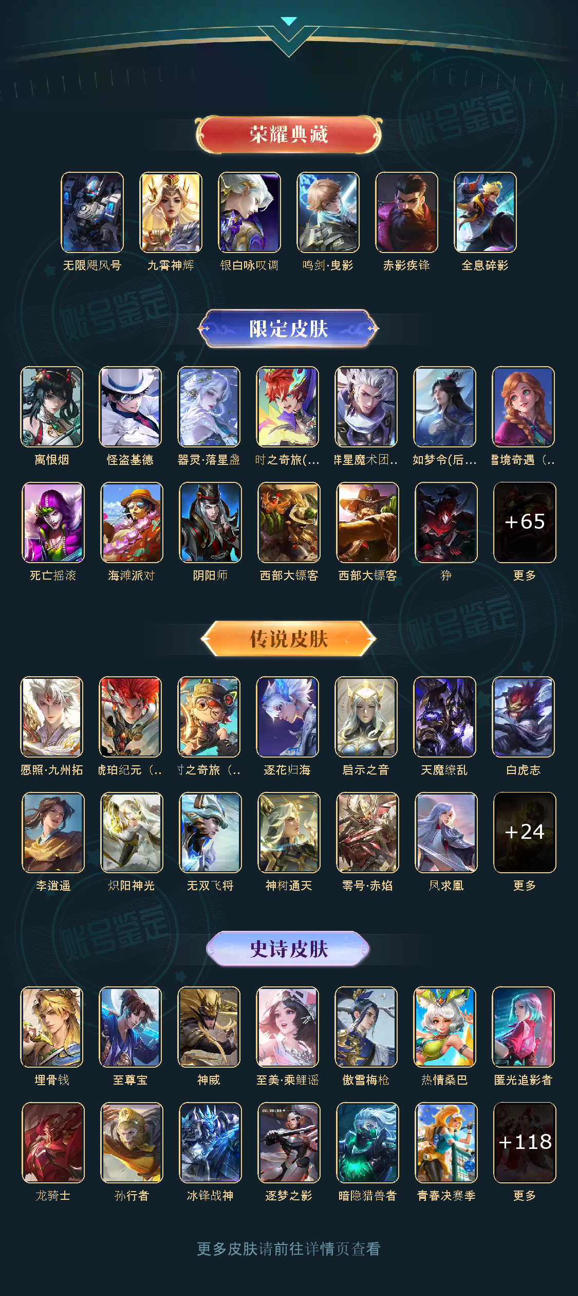 无限飓风号,鸣剑·曳影,赤影疾锋,九霄神辉,银白咏叹调,群星魔术团(韩信),离恨烟,天魔缭乱,白虎志,李逍遥,零号·赤焰,怪盗基德,炽阳神光,热情桑巴,至尊宝,神威,愿照·九州拓,匿光追影者,时之奇旅(鲁班七号),无双飞将,逐花归海,器灵·落星盏,琥珀纪元(马超),至美·乘鲤谣,时之奇旅(孙策),埋骨钱,启示之音,神树通天,傲雪梅枪