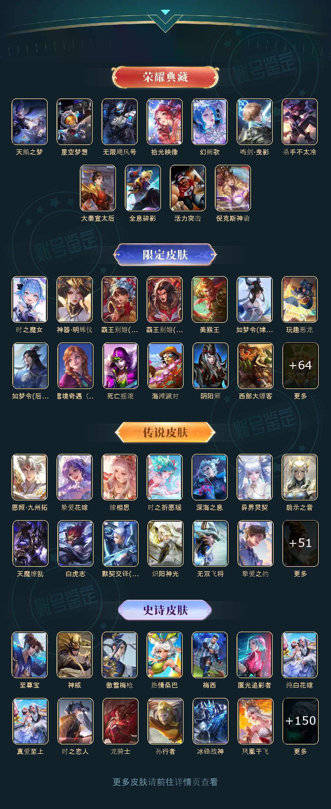 天鹅之梦,星空梦想,无限飓风号,鸣剑·曳影,幻阙歌,拾光映像,神器·明辉仪,时之魔女,天魔缭乱,白虎志,默契交锋(花木兰),零号·赤焰,炽阳神光,热情桑巴,梅西,至尊宝,神威,纯白花嫁,真爱至上,愿照·九州拓,匿光追影者,无双飞将,时之祈愿瑶,挚爱之约,挚爱花嫁,深海之息,补天,续相思,异界灵契,启示之音,傲雪梅枪