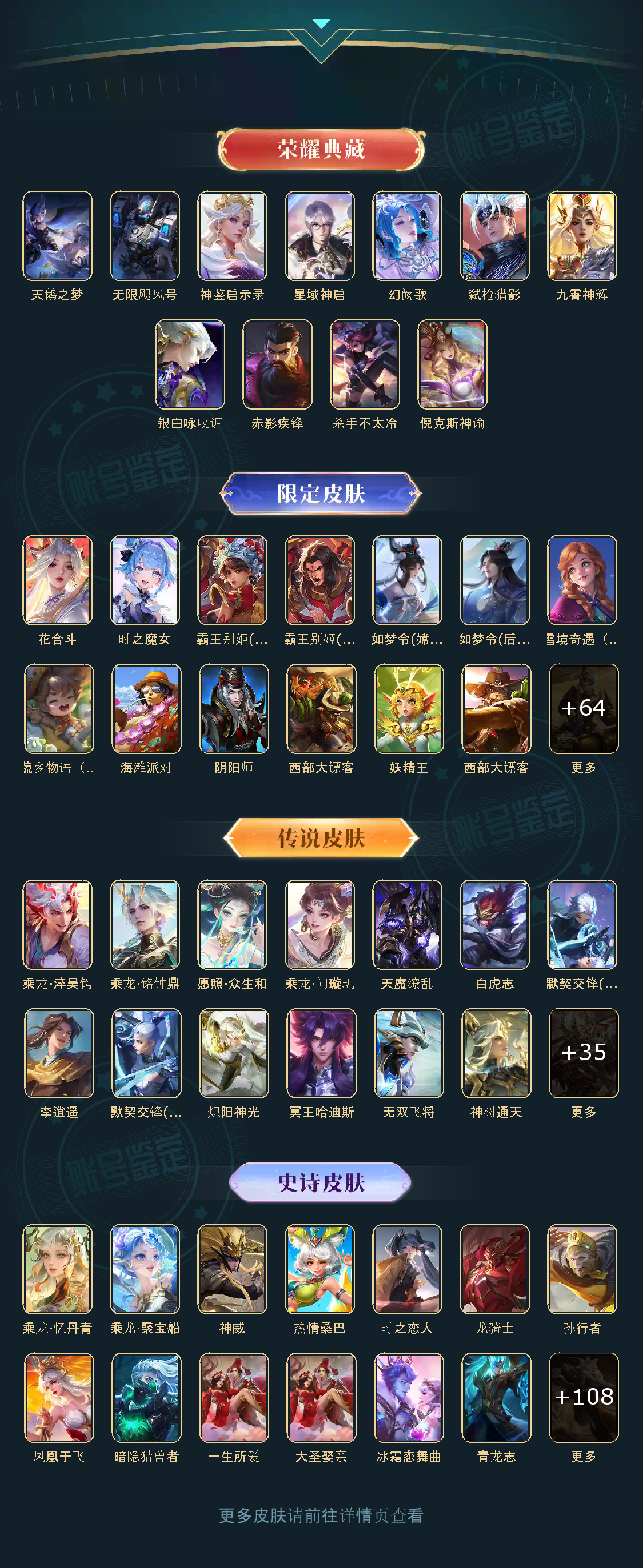 贵族等级V10,英雄数量125,典藏皮肤数10,皮肤数量411,杀手不太冷/无限飓风号/倪克斯神谕/星域神启