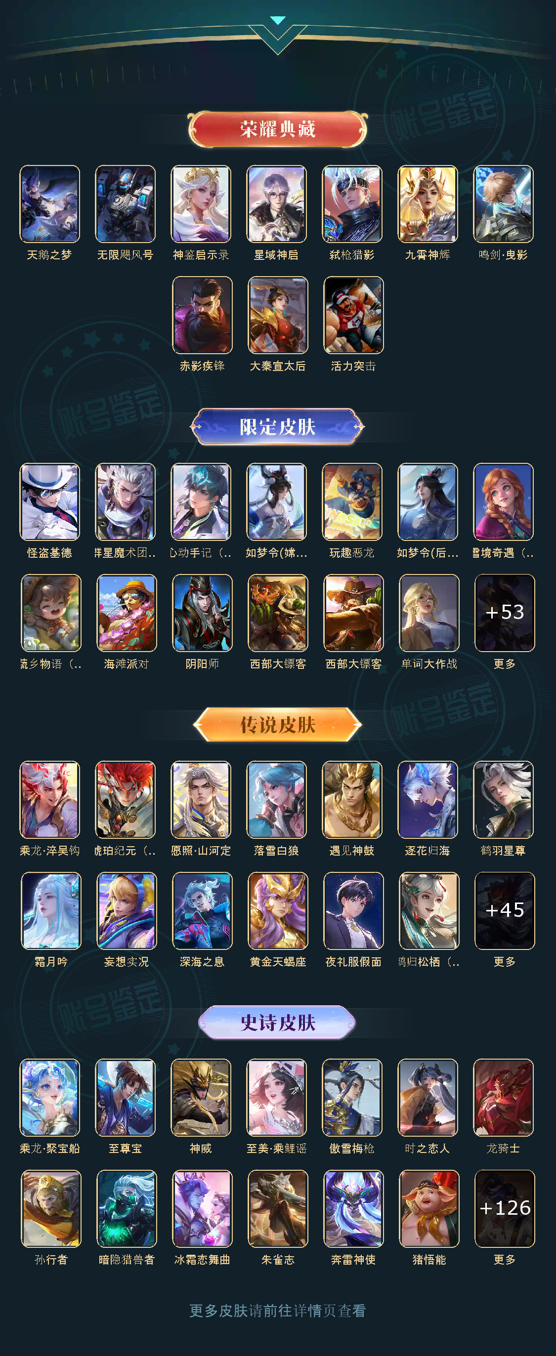 天鹅之梦,无限飓风号,鸣剑·曳影,神鉴启示录,赤影疾锋,星域神启,弑枪猎影,九霄神辉,群星魔术团(韩信),白虎志,零号·赤焰,怪盗基德,炽阳神光,乘龙·淬吴钩,乘龙·聚宝船,至尊宝,神威,冥王哈迪斯,落雪白狼,无双飞将,遇见神鼓,逐花归海,琥珀纪元(马超),至美·乘鲤谣,鹤羽星尊,霜月吟,妄想实况,深海之息,黄金天蝎座,夜礼服假面,惊梅引,心动手记(海诺),神树通天,鹤归松栖(云缨),愿照·山河定,傲雪梅枪