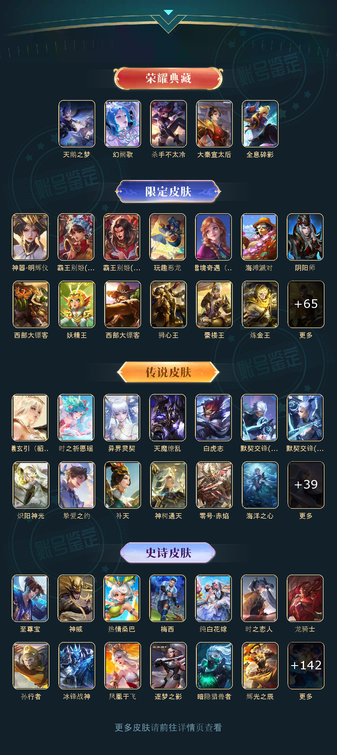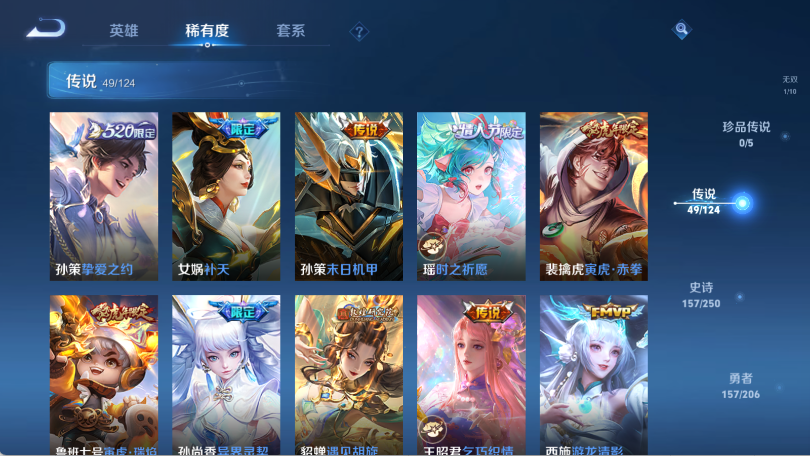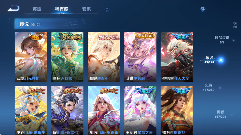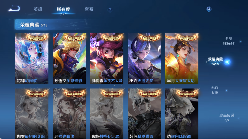 贵族等级V10,英雄数量125,典藏皮肤数5,皮肤数量453,