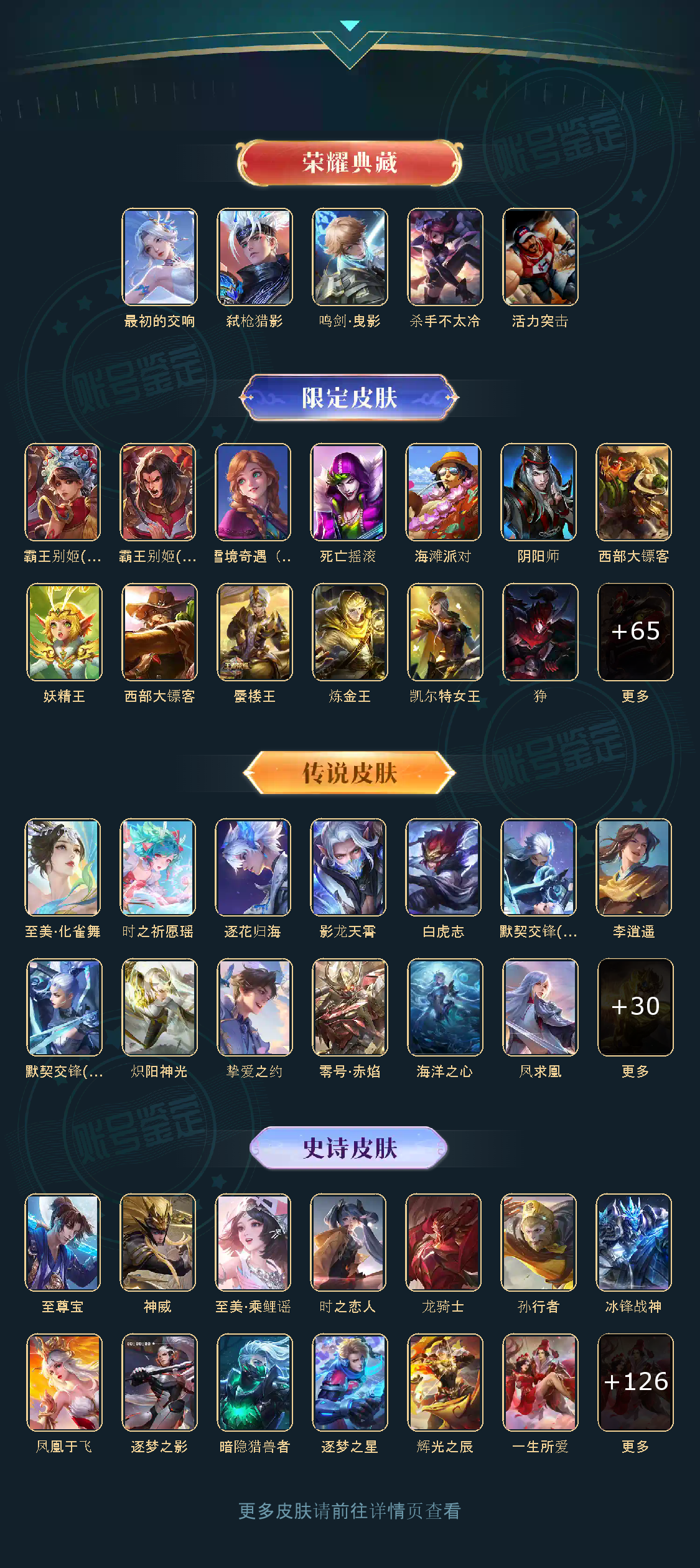 贵族等级V10,英雄数量126,典藏皮肤数4,皮肤数量435,冰锋战神街头霸王至尊宝杀手不太冷王者之锤凤求凰逐梦之影神奇女侠黄金狮子座一生所爱大圣娶亲白虎志朱雀志活力突击梁祝鸣剑·曳影龙胆李逍遥武圣奔雷神使孙行者神威淬星耀世时雨天司