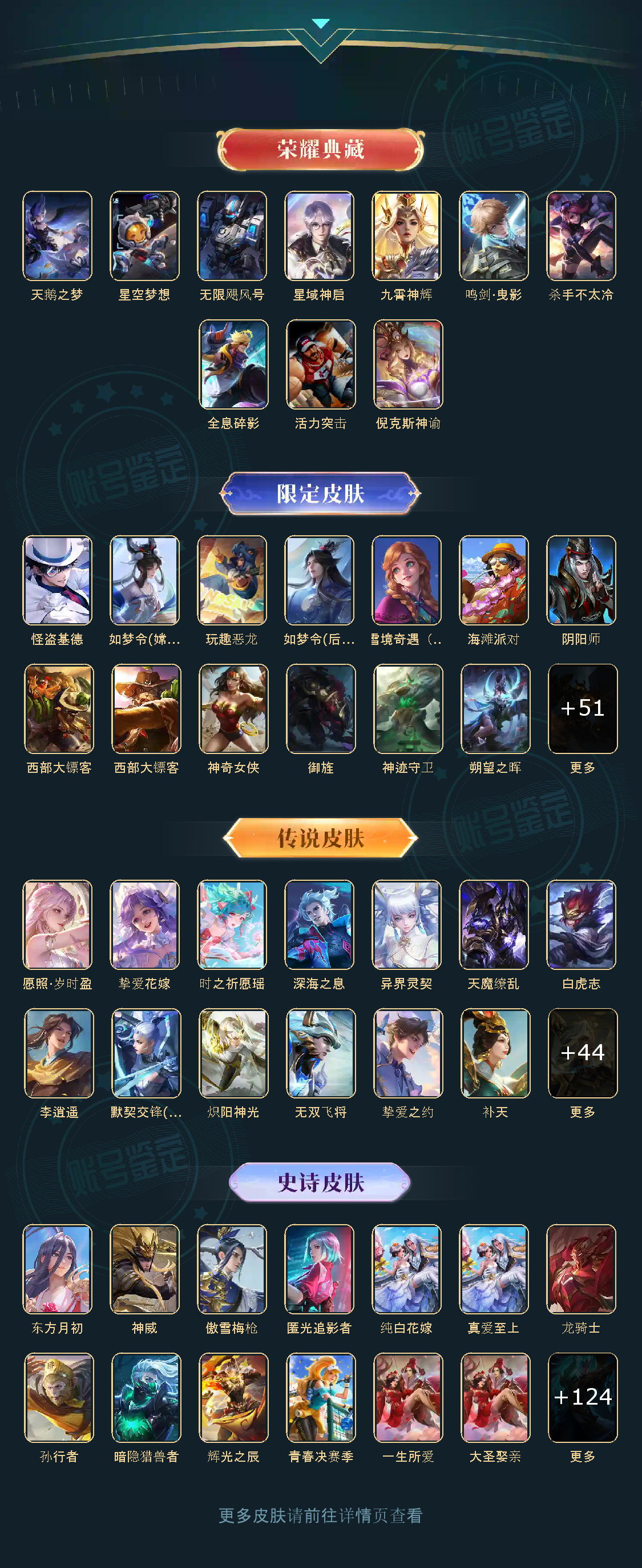 贵族等级V10,英雄数量125,典藏皮肤数10,皮肤数量402,天鹅之梦/杀手不太冷/星空梦想/无限飓风号/全息碎影/活力突击/倪克斯神谕/鸣剑·曳影/星域神启
