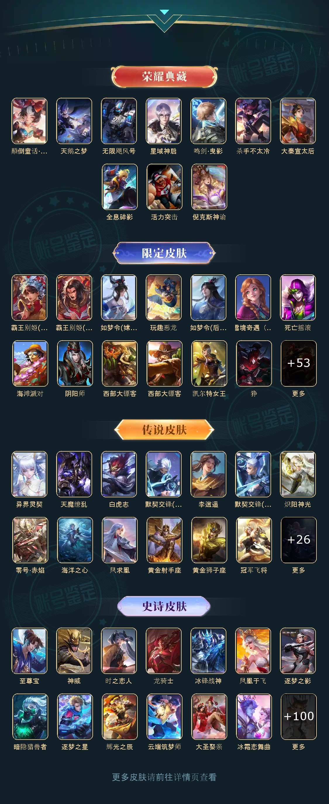 贵族等级V10,英雄数量124,典藏皮肤数9,皮肤数量380,天鹅之梦/杀手不太冷/大秦宣太后/无限飓风号/全息碎影/活力突击/倪克斯神谕/鸣剑·曳影/星域神启