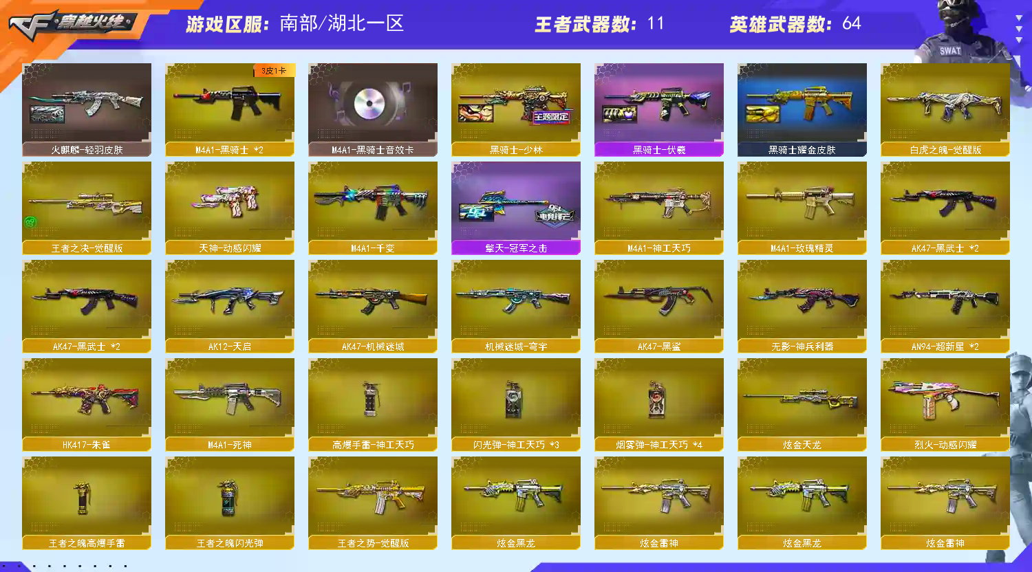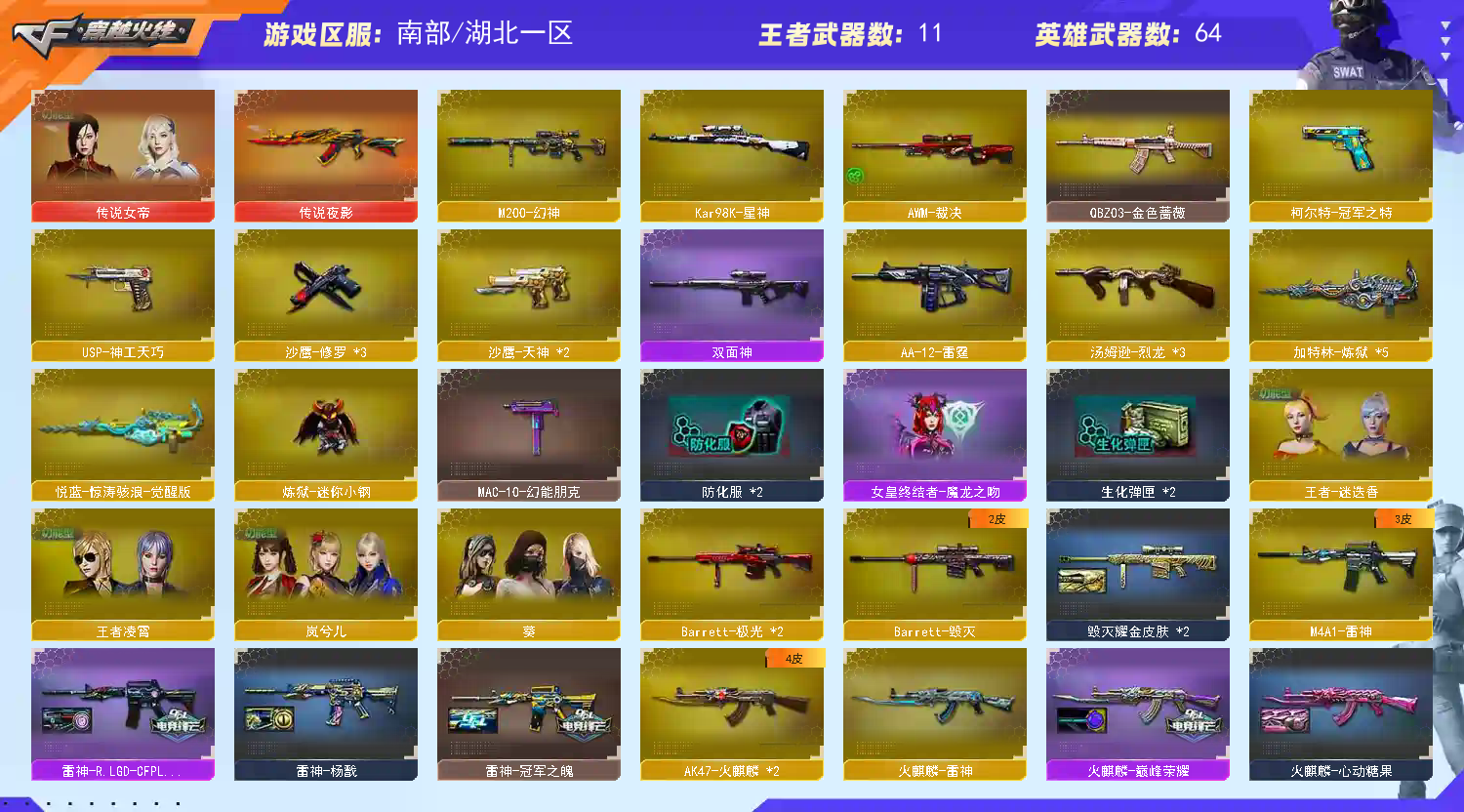 稀有武器:传说夜影/M200幻神/Kar98K星神/HK417朱雀/加特林炼狱X4+悦蓝-惊涛骇浪+炼狱小刚/烈龙X3+死亡之眼-女皇终结者-堕落天使/M4AI神工天巧/USP神工天巧/柯尔特冠军之特/QBZ金色蔷薇/王者青龙X2/白虎之魄/