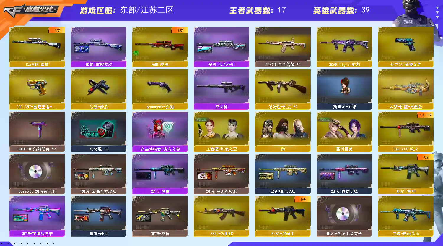 稀有武器:98K星神、M200竞技荣光、QBZ03金色蔷薇X2、白虎电玩蓝兔、烈龙X2、炼狱悦蓝、火麒麟、雷神、黑骑士、超新星、无影神兵利器、死神雪域霜狐、烈火动感闪耀、毁灭、裁决、暗月传说、柯尔特竞技荣光、COP357雷霆王者、擎天竞技荣光、擎天、修罗、天神动感闪耀、屠龙动感闪耀