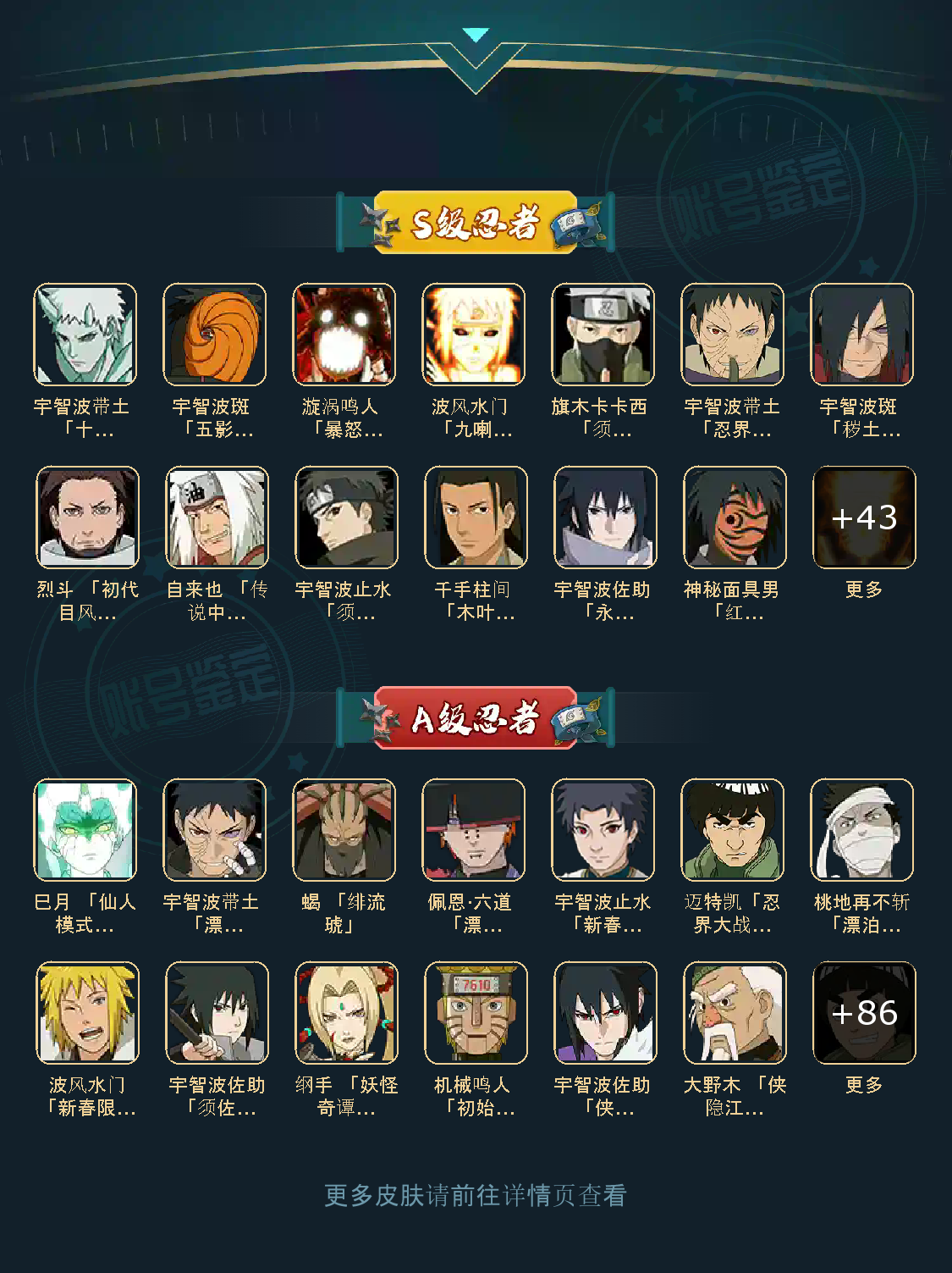 夏日黑土 仙人自来也 纲手 波风水门 百战水门 猿飞日斩 千手柱间 宇智波斑 宇智波鼬 舞之自来也 大蛇丸 百战大蛇 秽土四代 秽土三代 秽土长门 仙人兜 黄猿九喇嘛鸣人 紫狗永恒佐助 樱婊忍战樱 秽土鼬 普通自来也 百豪纲手 死门凯 二代扉间 秽土二代 秽土初代 秽土柱间 白面具 须佐卡卡西 小胡子鬼灯幻月 雷影 土影 无 佩恩 百战佩恩 青年柱间 创立初代 秽土斑 青年斑 解斑 须佐止水 虎皮 破面带土 红夜带土 罗砂 秽土三代风影 忍战雷影 三代雷影 金角银角 秽土半藏 忍战大野木 小土豆 天道超 大筒木桃式 大筒木金式 钢铁之躯凯 桀骜之刃阿斯玛 狂野之鲨鬼鲛 飞段 新春大蛇丸 黑飞段 百豪樱 忍战李 大卡卡西 五代水影照美冥 宇智波鼬 仙鸣 九尾查克拉鸣人 鹰佐 奇拉比 青年艾 半蛇兜 晓蛇 新春鼬 面麻 须佐佐助 疾风咒印佐助 忍战宁次 忍战天天 最终章雏田 幻容卡卡西 神卡 忍战卡卡西 泳装卡卡西 忍战凯 青春哥 惊门凯 爱情哥 新春止水 新春水门 青年水门 青水 新春我爱罗 泳装照美冥 侠隐照美冥 侠隐纲手 侠隐兜 漂泊再不斩 漂泊佩恩 漂泊二代 漂泊小南 漂泊佩恩 三船 青年三船 青年长门 泳装南 新春南 晓创生角度 晓创生蝎 晓创生飞段 泳装鼬 鲛肌融合鬼鲛 新春迪达拉 秽土迪达拉 恶灵之影飞段 暴怒带土 忍战黄土 卑留呼 桃博 黑土