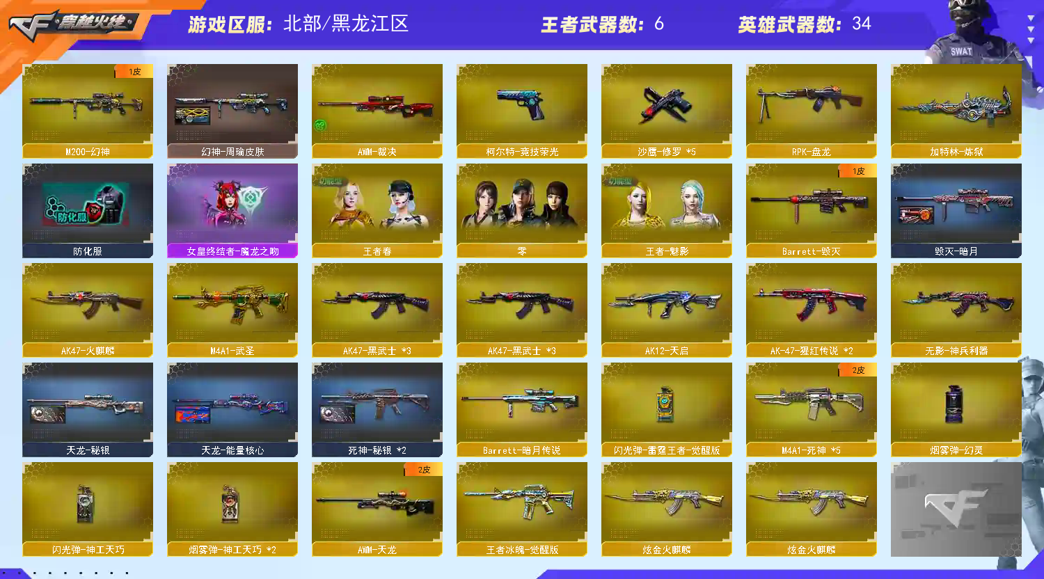 北部黑龙江区本游戏账号:英雄武器34个; 王者武器5个。 装备不多,但是主武器、副武器、近身武器够用 拥有完美游戏体验。重要的是,特殊装备有:AK47-火麒麟、M200-幻神、加特林-炼狱、柯尔特-竞技荣光、王者冰魄-觉醒版、炫金火麒麟、王者之灵、职业选手、王者-魅影、堕天使、等,随意畅选。