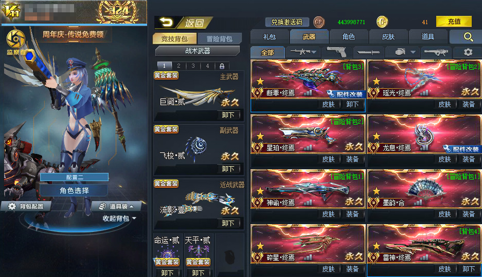 拥有几乎全满配武器:满配天际◆满配破魂◆满配岚翼◆满配赤血之源◆满配焚风◆满配鬼刃修罗◆满配奏鸣◆满配幻彩星涡◆满配藤木蔓芯◆满配闪击◆满配尘埃◆满配绝境◆满配玄天◆满配末世◆满配弧光◆满配黑炎◆满配连城◆满配跳跳锤◆满配核子裂变◆满配迷你派拉◆满配裂隙行者◆满配帝王战锤◆满配幻彩天虹◆满配子龙◆满配伏虎◆满配尘羽◆满配轮回◆满配蛮牙◆满配夜枭◆满配终末之弩◆满配盖亚◆满配骑兵◆满配赛博◆满配玄武◆满配魔杰◆满配天引◆满配猎犬◆满配冬日温情◆满配陷阵◆满含光◆满配空间◆满浪淘沙◆满配万兽◆满配逐浪◆124焰龙◆三凝视◆满配风暴◆极空刃◆满配原石之力◆降临◆满配不朽◆双满灵狩◆满配镭射◆满配獠牙◆满原石之怒◆双满翎羽◆12耀光◆满配镇压者◆火山◆满配瞬影◆满配天界◆满配戏法◆满配幻锋◆满配比伯◆满配致远星◆满领域◆满配破空◆满配白龙◆满配光棱◆如意火铳