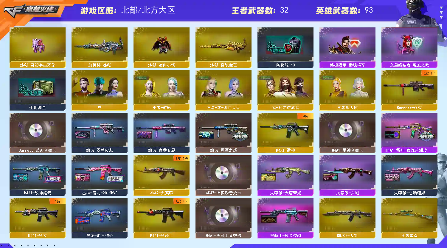 重要武器皮肤:幻神-冠军之幻、星神-璀璨皮肤、毁灭-冠军之怒、毁灭-墨兰皮肤、毁灭-直播专属、天龙-CFSTAR、AWM-裁决-百城联赛天津皮肤、火麒麟-CFSTAR、火麒麟-大唐荣光、火麒麟-心动糖果、火麒麟-百城、M4A1-雷神-巅峰荣耀皮肤、雷神-宠儿-2019MVP、黑骑士-摸金校尉、黑龙-能量核心、M4A1-战神赵云、白虎-大汉风骨、白虎-AG- CFPLS20冠军、QBZ03-AG-CFPLS19冠军、修罗- CFSTAR、屠龙-荣耀之锋、龙啸-冠军之啸