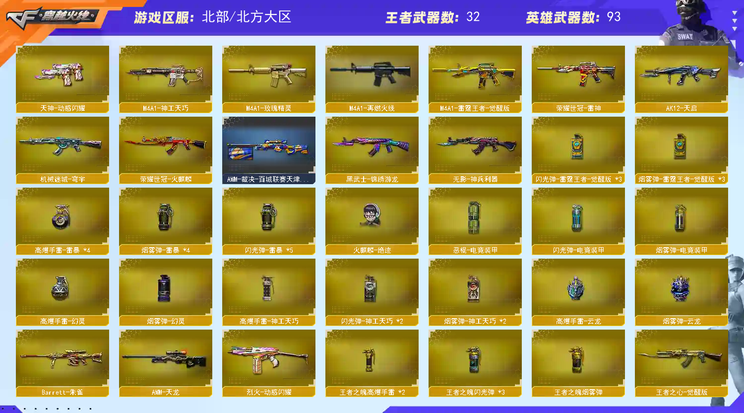 狱、COP 357-云龙、COP 357-雷霆王者-觉醒版(2)、天神-动感闪耀、沙鹰-天神、沙鹰-修罗、荣耀世冠-柯尔特、柯尔特-电竞装甲、USP-雷暴、USP-神工天巧、云龙扇、王者之刺-觉醒版、荣耀世冠-龙啸(2)、擎天、屠龙-动感闪耀、屠龙、王者之锋-觉醒版、雷霆王者之锋-觉醒版(2)、斩神刀-雷暴、唐刀-神工天巧、炽芒蝶刃(3)、手雷-动感闪耀、高爆手雷-云龙、高爆手雷-神工天巧、高爆手雷-幻灵、高爆手雷-雷暴(4)、烟雾弹-云龙、烟雾弹-神工天巧(2)、烟雾弹-幻灵、烟雾弹-雷暴(4)、烟雾弹-电竞装甲、恶棍-电竞装甲、烟雾弹-雷霆王者-觉醒版(3)、闪光弹-神工天巧(2)、闪光弹-雷暴(5)、闪光弹-电竞装甲、闪光弹-雷霆王者-觉醒(3)、机械迷城-穹宇、黑武士-锦绣游龙、超新星-热不奇洋、VSK-94-金蚀、龙啸-热带奇洋、龙啸-烈火龙威、手雷-热带奇洋