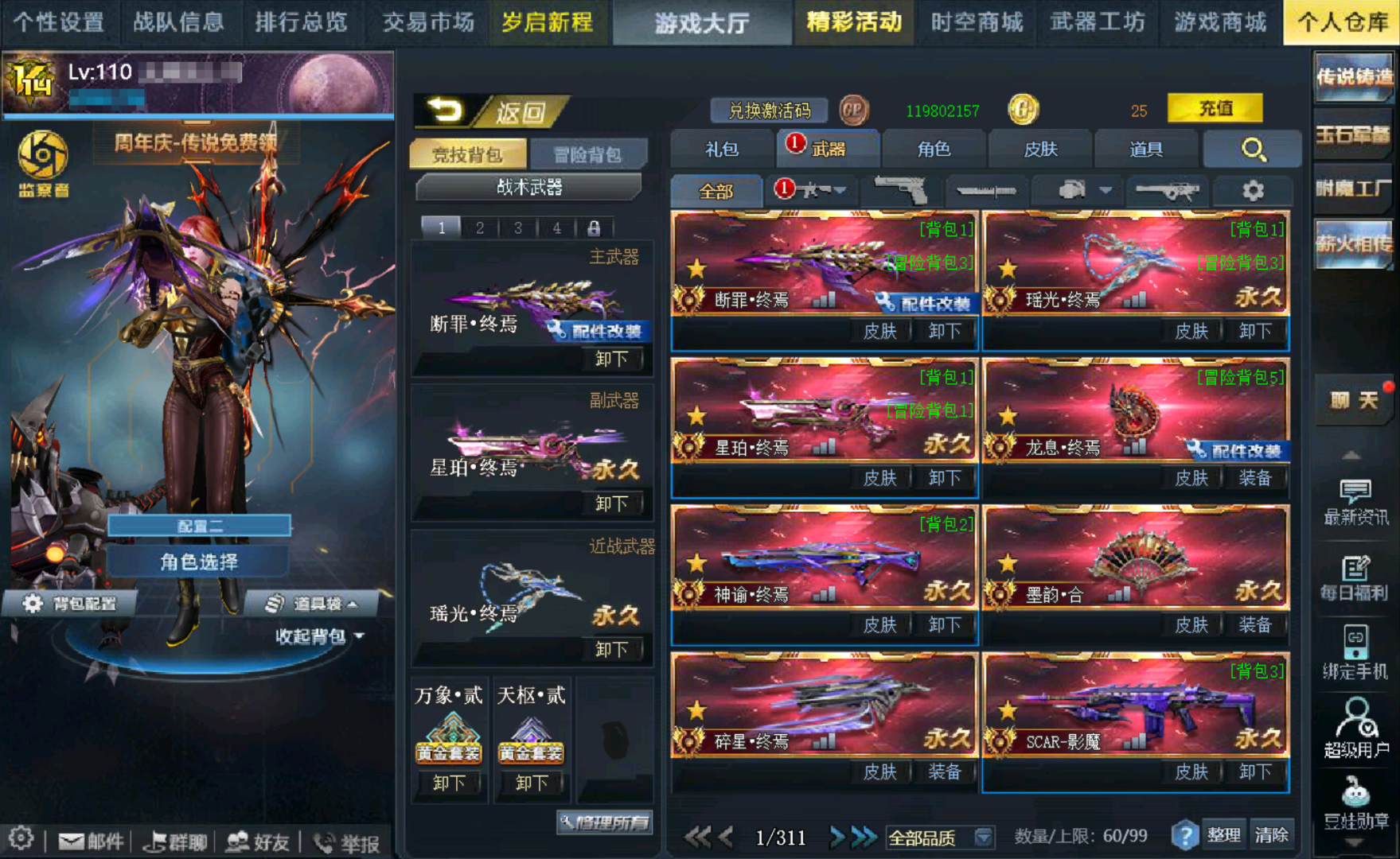 传说武器:◆断罪终焉(紫黛)◆瑶光终焉◆星珀终焉◆RPK主宰◆龙息·终焉◆神谕·终焉◆AK47主宰◆墨韵·合◆碎星·终焉◆SCAR-影魔◆无尽光影·终焉◆M4A1无限EX◆屠魔◆AK47天神◆万化主宰