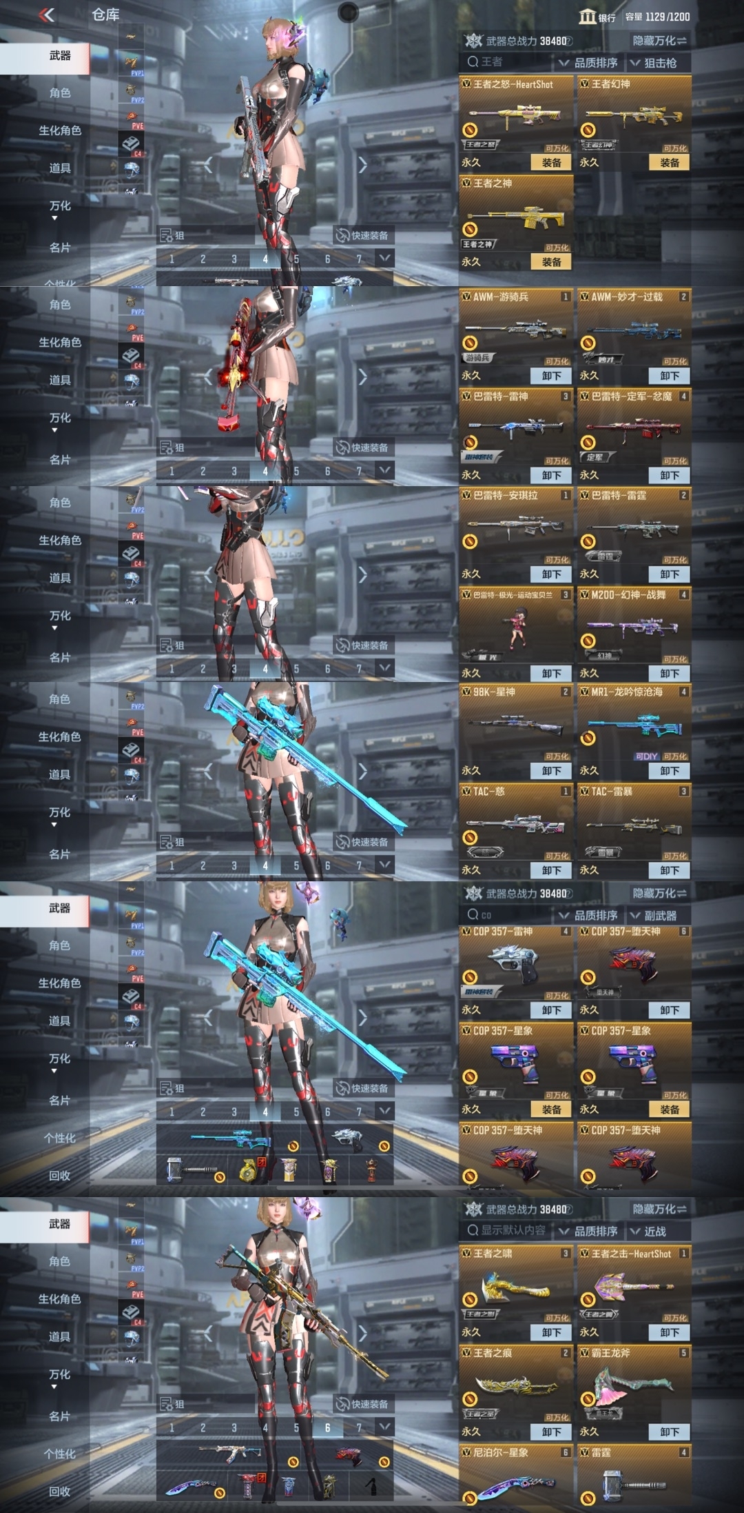 王心女团拉丝,王影冰霜奇迹,王翼,王魄女团拉丝,王魄白金血钻,王武,王者幻神王幻,王怒女团拉丝,王神,游骑兵AWM,幻神战舞,星神,雷暴tac,雷神巴雷特,雷霆巴雷特,妙才过载,太史慈,定军忿魔,常胜,孟德过载,奉先无双,元让,81瑜,文远,星象套,仲达过载,威侯套,武圣套,游骑兵梦魇,游骑兵寒霜,机械纪元MK47,美杜莎,光明之神81,波塞冬,风神翼龙套,雷霆m4,雷暴m4,哈迪斯,王狱,斯太尔蝴蝶,宙斯套,雷神aa12,霸王龙