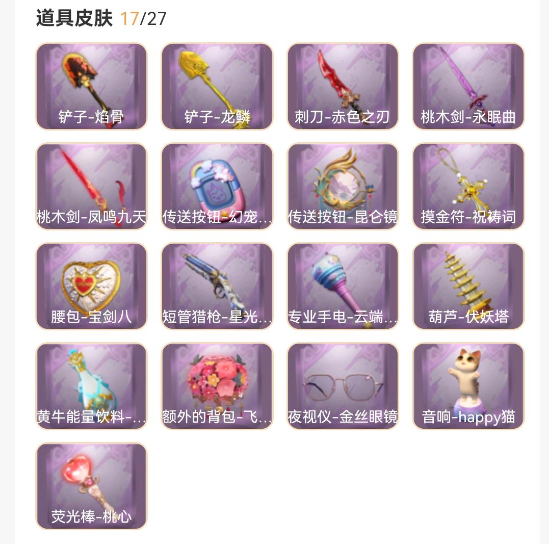 铲铲币:;幻梦皮肤:1个;金色皮肤3个;紫色皮肤:14个;道具皮肤17个;皮肤:巫铃儿-镜生遗梦,小黄-遗失的童话,薇薇安-圣光之谕,巫铃儿-镜花辞,小黄-罗丽,爱丽丝-冰公主,爱丽丝-丝缕哀歌,零-青云逸歌,零-赤炼将军,阿念-王子与骑士,阿念-灵昭鹿鸣,逍遥-绣春逍影,逍遥-泽引山海,薇薇安-白光莹,薇薇安-黑月挽歌,巫铃儿-素影瑶光,莉莉-情公主,艾伦-水王子;道具:刺刀-赤色之刃,铲子-龙鳞,铲子-焰骨,桃木剑-凤鸣九天,桃木剑-永眠曲,传送按钮-昆仑镜,传送按钮-幻宠之门,摸金符-祝祷词,腰包-宝剑八,短管猎枪-星光的裁决,专业手电-云端梦想计划,葫芦-伏妖塔,黄牛能量饮料-青玉抱丹,额外的背包-飞花令,夜视仪-金丝眼镜,音响-happy猫,荧光棒-桃心-荧光棒-桃心;饰品:头饰-咬咬鲨头套,头饰-炙热烧烤,头饰-驼半仙头套,头饰-鱼头怪头套,头饰-烈焰红唇头套,头饰-面具马头套,头饰-哈士奇头套,头饰-萨卡班甲鱼头套,头饰-嘻嘻头套,头饰-滑稽头套,头饰-呆滞头套,头饰-卑微头套,背饰-小小情公主,背饰-小小白光莹,背饰-小小冰公主,背饰-小小水王子,背饰-蝶恋花,背饰-毛球夹子,挂饰-钗头凤,挂饰-小鲨包包,挂饰-天使消失的年代,挂饰-未竟乐园,挂饰-小小玛丽;动作:动作-鹏友摇,动作-DL摇,动作-心跳摇,动作-舞台中心,动作-小雨摇,动作-星奇摇,动作-律动迪斯科,动作-山楂树之舞,动作-痞帅进行曲,动作-抬手;工牌:工牌-卷珠帘,工牌-情语塔,工牌-冰晶宫,工牌-水玲珑宫,工牌-雷霆轩,工牌-花蕾城堡,工牌-点点萌伴,工牌-童话扉页,工牌-舞台终演;员工:小黄,爱丽丝,零,阿念,逍遥,薇薇安,巫铃儿,莉莉,艾伦