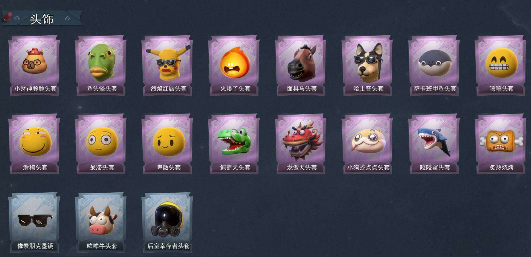 【头饰】小财神豚豚头套、鱼头怪头套、烈焰红唇头套、火爆了头套、面具马头套、哈士奇头套、萨卡班甲鱼头套、嘻嘻头套、滑稽头套、呆滞头套、卑微头套、鳄霸天头套、龙傲天头套、小狗蛇点点头套、咬咬鲨头套、炙热烧烤、像素朋克墨镜、哞哞牛头套、后室幸存者头套