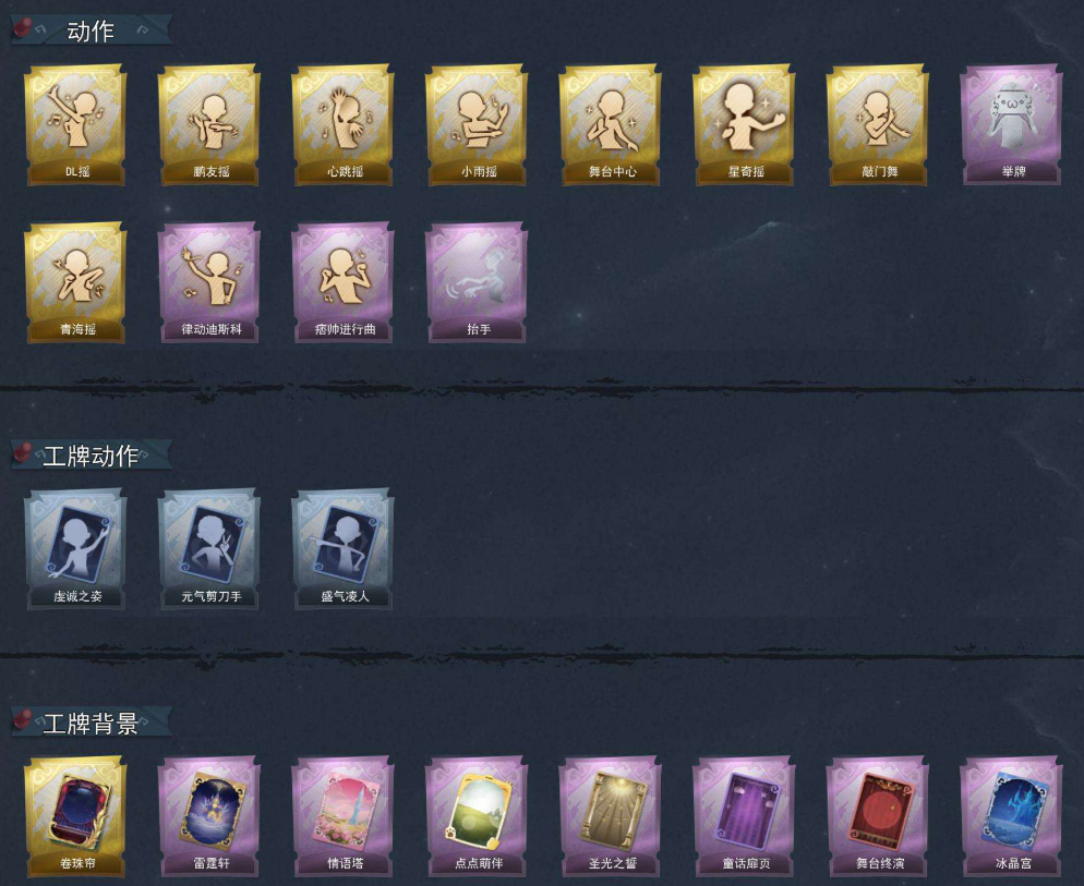 【动作】DL摇、鹏友摇、心跳摇、小雨摇、舞台中心、星奇摇、敲门舞、举牌、青海摇、律动迪斯科、痞帅进行曲、抬手