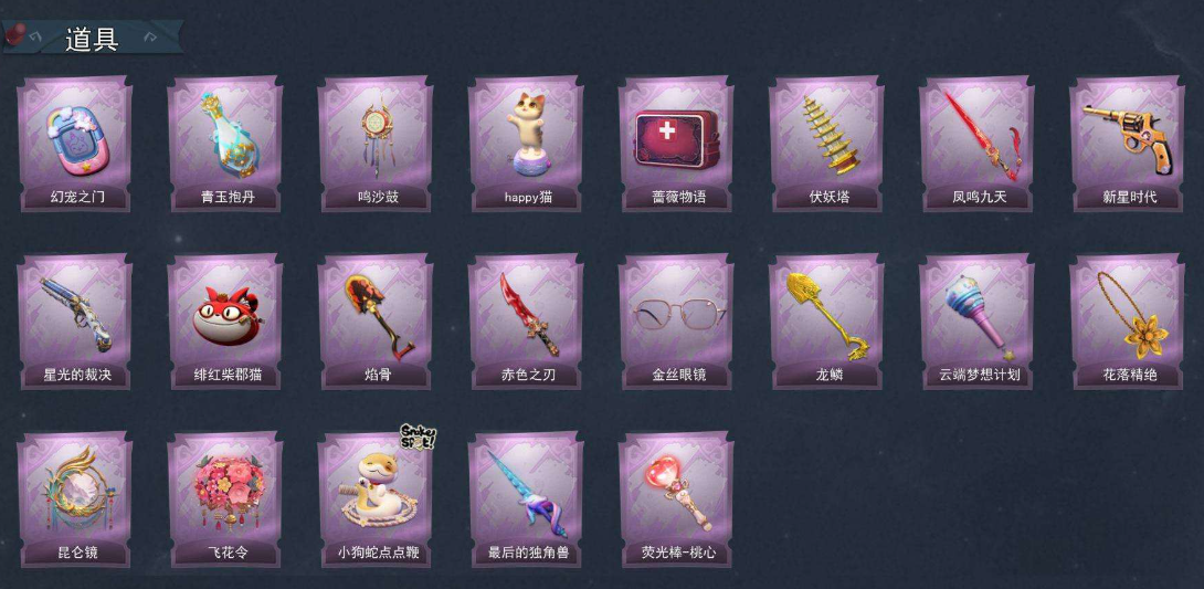 【道具皮肤】传送按钮-幻宠之门、黄牛能量饮料-青玉抱丹、音响-happy猫、急救包-蔷薇物语、葫芦-伏妖塔、桃木剑-凤鸣九天、转轮手枪-新星时代、短管猎枪-星光的裁决、腰包-绯红柴郡猫、铲子-焰骨、刺刀-赤色之刃、夜视仪-金丝眼镜、铲子-龙鳞、专业手电-云端梦想计划、摸金符-花落精绝、传送按钮-昆仑镜、额外的背包-飞花令、长鞭-小狗蛇点点鞭、桃木剑-最后的独角兽