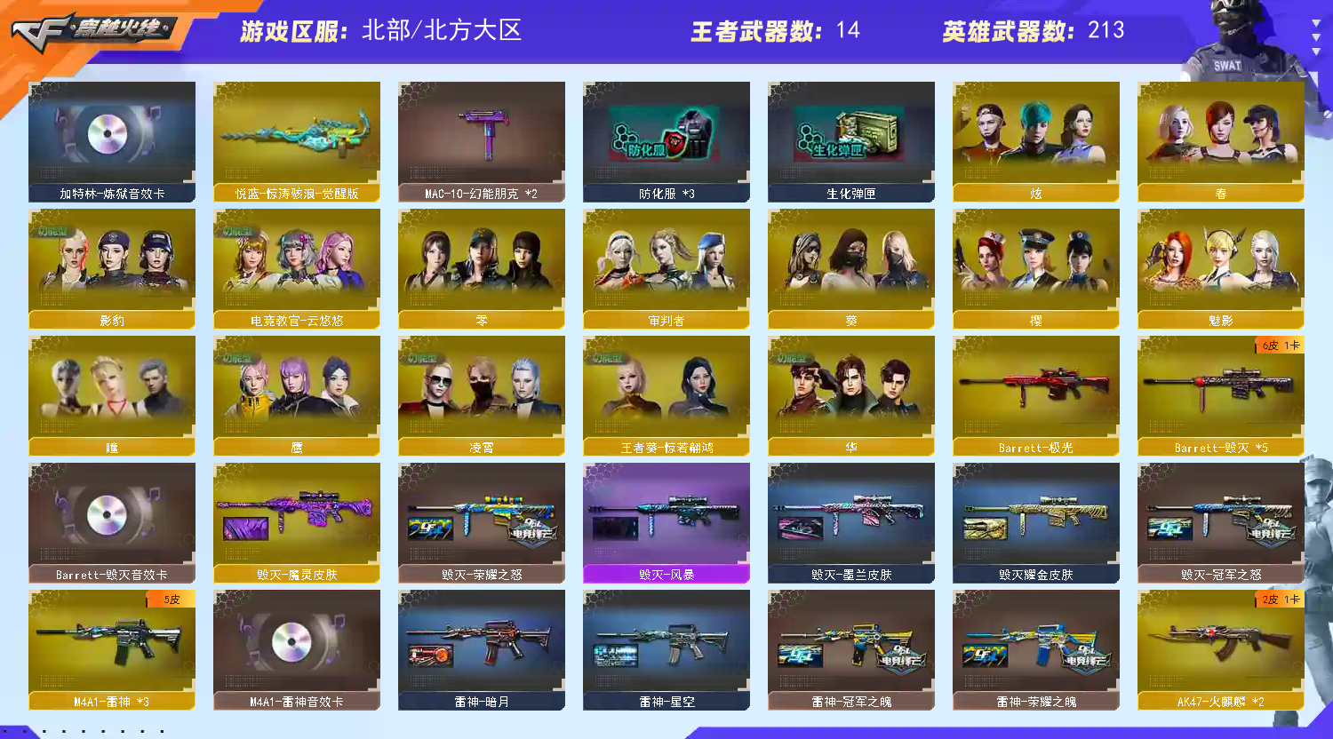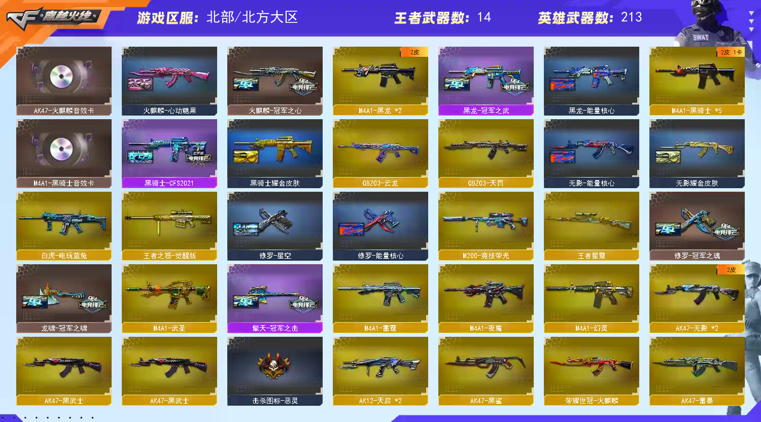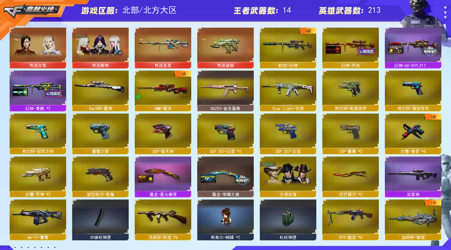 稀有武器:传说圣灵、传说破晓、M200幻神、盘龙X6、炼狱X2、烈龙X6、98K星神、M200竞技荣光、Scar白虎、QBZ天罚、QBZ云龙、QBZ金色蔷薇、M4A1幻灵、火麒麟、黑龙X2、雷神X3、黑骑士X5、无影X2、死神、黑武士、天启、超新星、武圣、雷霆、雷暴、超新星热带奇洋、白虎电玩蓝兔、天龙X2、毁灭X5、极光、雷霆、修罗X4、天神、COP雷霆、USP雷暴X2、COP堕天神、破空枪刃夜魔、柯尔特电竞装甲、COP幻灵X2、柯尔特竞技荣光、COP云龙、柯尔特冠军之特、屠龙X4、龙啸、擎天X2、麒麟刺X2、斩神刀雷暴、幻灵之锋X2、炽芒蝶刃X5、唐刀神工天巧、云龙扇、龙啸热带奇洋